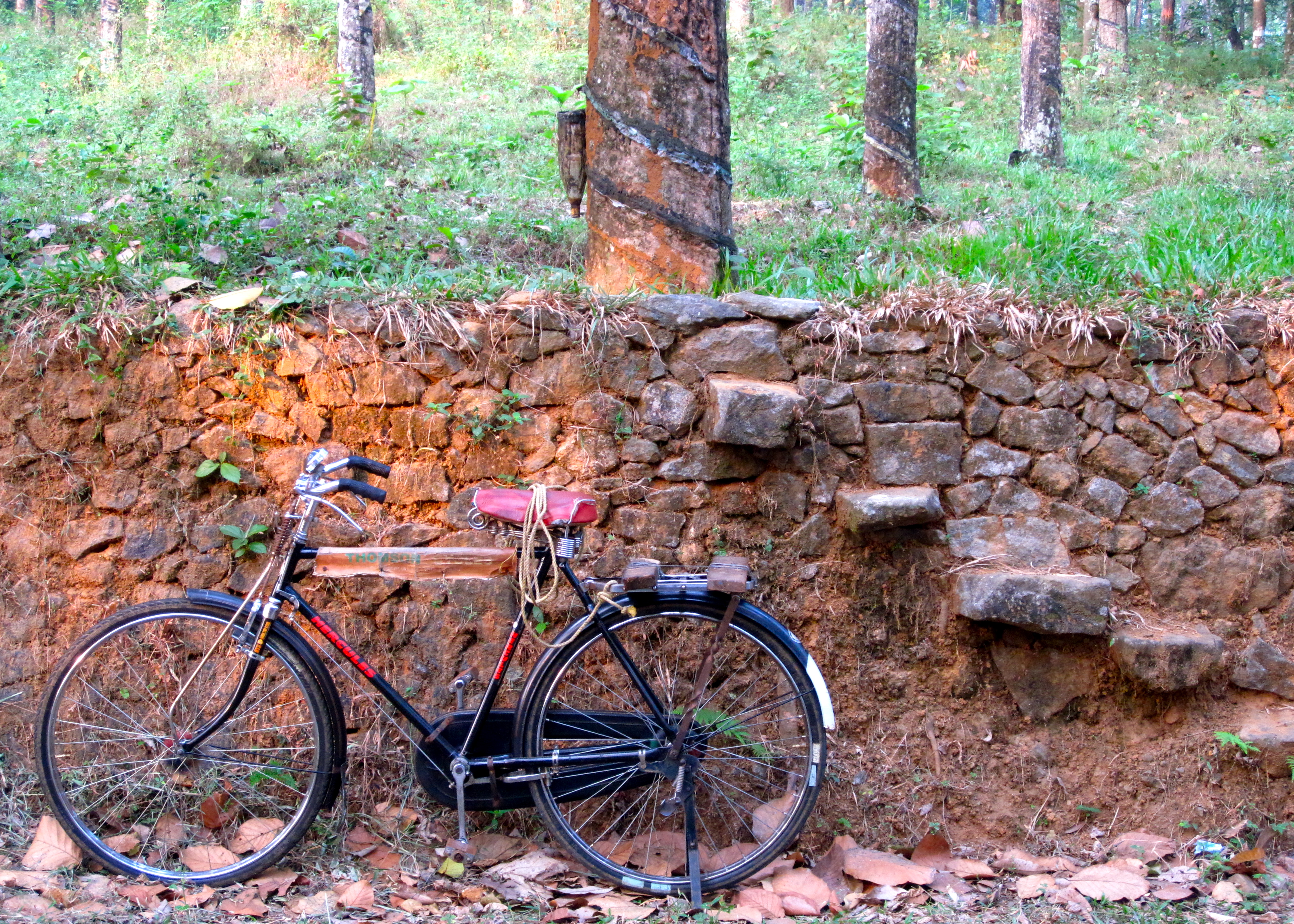 Classic Indian bike at a rubber plantation (rubber trees and taps in background)