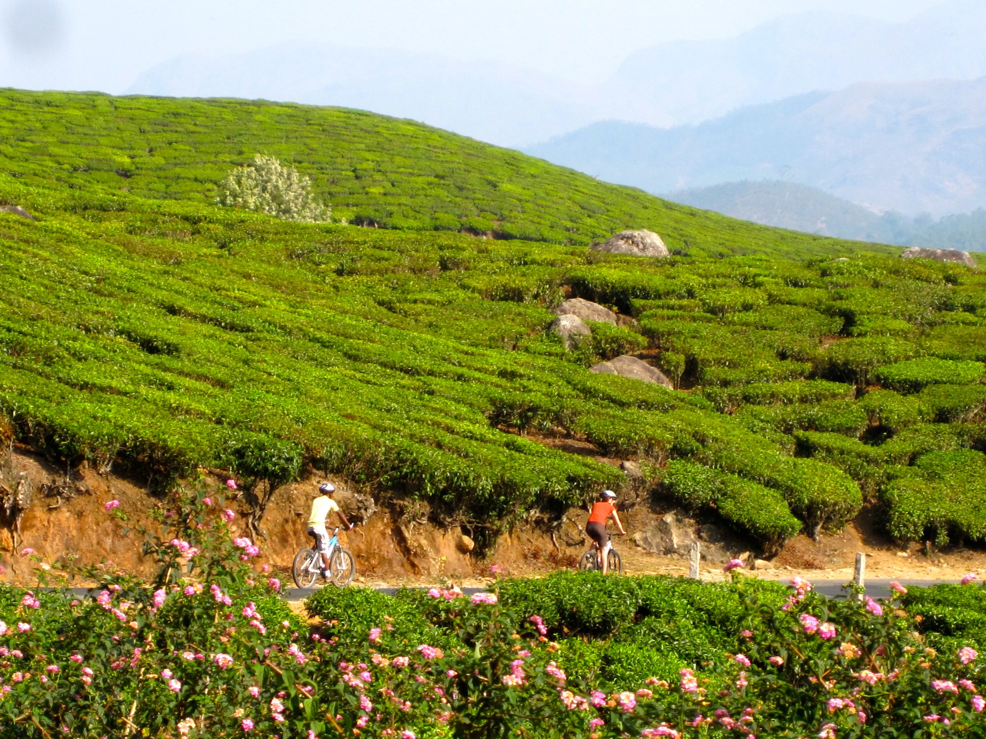 Riding through the tea plantations around Munnar