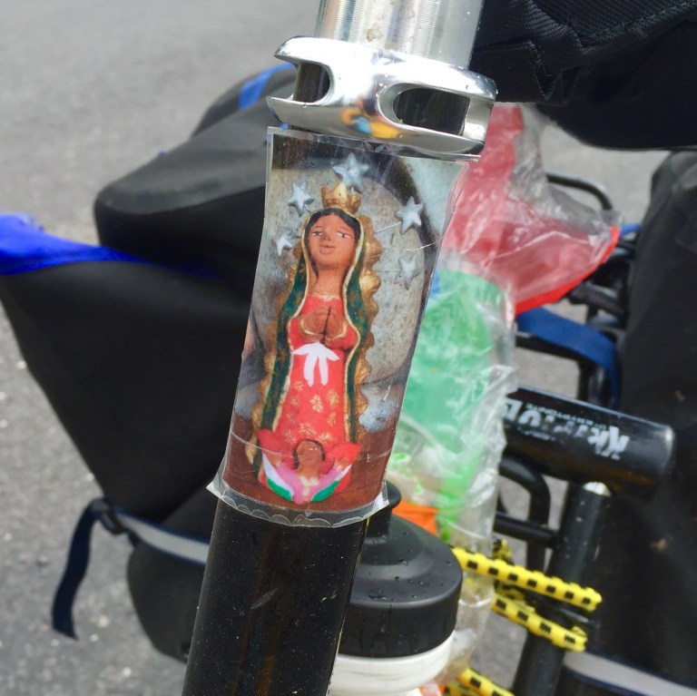One final note for today: Many of you know that my wonderful mom has a deep and long held affection for Catholic iconography, especially saints. Before departing, she gave me an image of the Virgin of Guadeloupe (the patron saint of Mexico) to bring with me on my trip through Eastern Europe. It was an unusual choice, to say the least, but so far she’s vigilantly keeping an eye on things from my seat post.