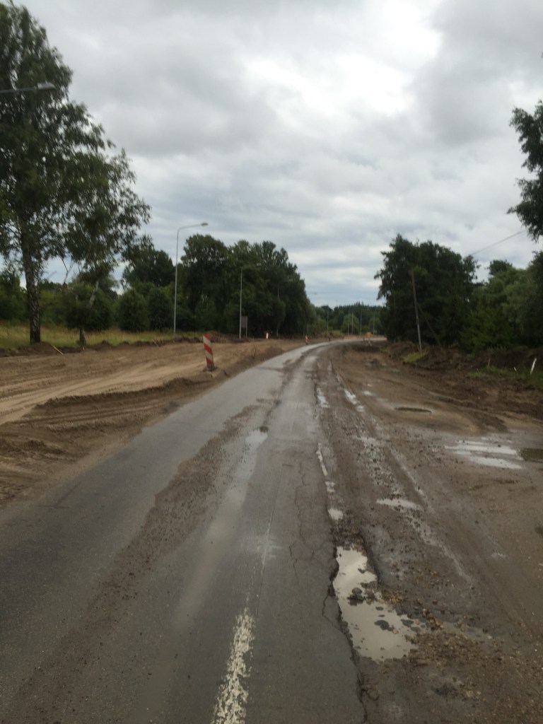 I crossed into Latvia over a small bridge and the small road I was enjoying turned into the main highway, which the EU is upgrading. Bottom line for me: muddy road construction and large trucks splashing past for miles and miles. Oh, and rain and a strong headwind!