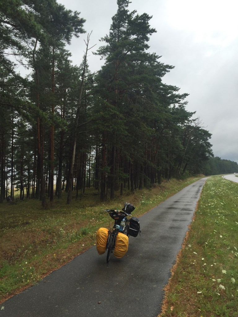 Time to put the head down and grind out some miles, which I did save for one rest stop in a cinder block Russian era bus shelter in the middle of nowhere. A few hours later the road conditions were much improved, with a pretty bike path along the sea and well marked Eurovelo route signs, but still rain and my invisible nemesis the headwind.