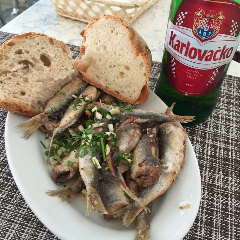 I don’t think “America” and “kraut aficionado” fit together in her mind. Nevertheless, still chuckling, she reached into her barrel and dug out a generous helping for me, served in a little plastic bag. I ate it as I walked and it was tangy, crunchy and delicious! Later, I enjoyed what might be my favorite lunch of the trip: local sardines fried with big chunks of garlic and sprinkled with parsley and salt, served with big hunks of crusty bread and a cold beer.