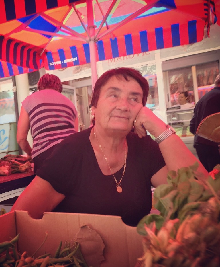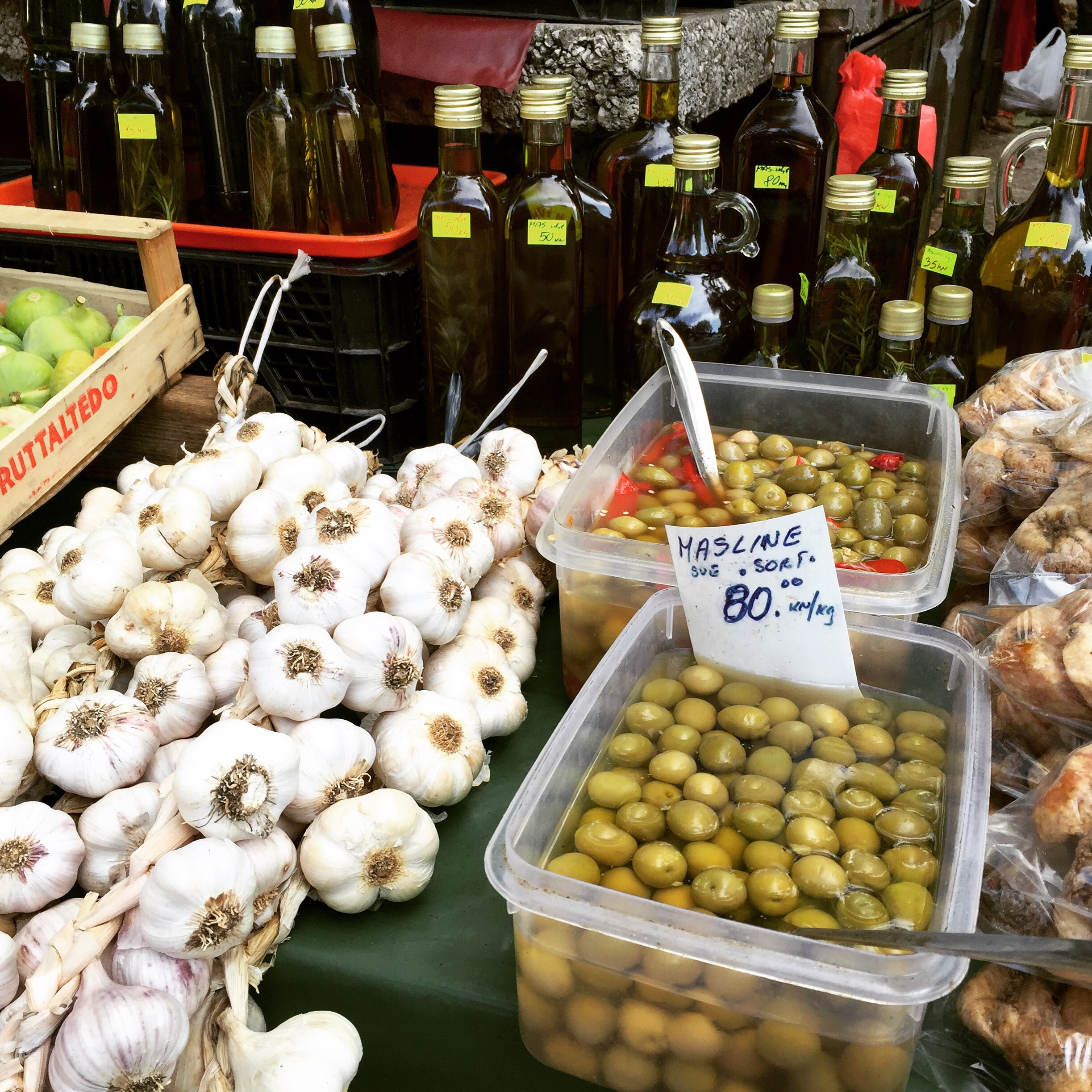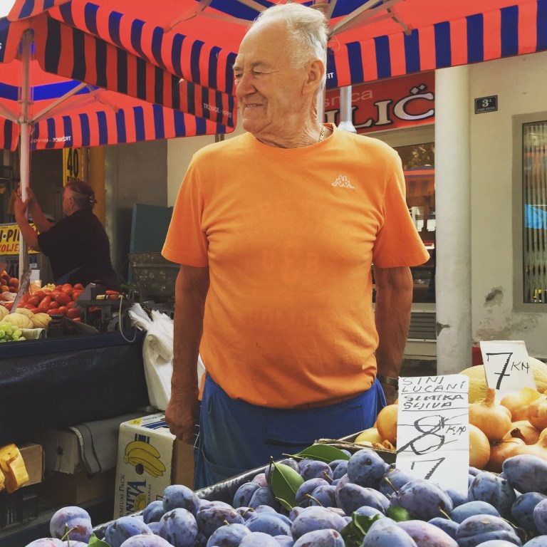 After hearing from our Croatian hotel owner Dean (“like James Dean” he said) that lost bags on flights through Rome are quite common and often take five days to get returned, we were obviously a bit anxious, especially with a ferry booked for the island of Korčula tomorrow morning and Athens still a long way off. With one flight a day from Rome, arriving at 7:10 PM, and Allegra’s bike needing to be on it, we kept our fingers crossed. But it didn’t stop us from having a great day, the highlights of which were a trip to the market, a walk to the beach, an outstanding lunch of bakalar, a soup of salted codfish and potatoes, and pier fish fried with garlic and olive oil, tasty little things that are smaller than sardines and eaten whole.