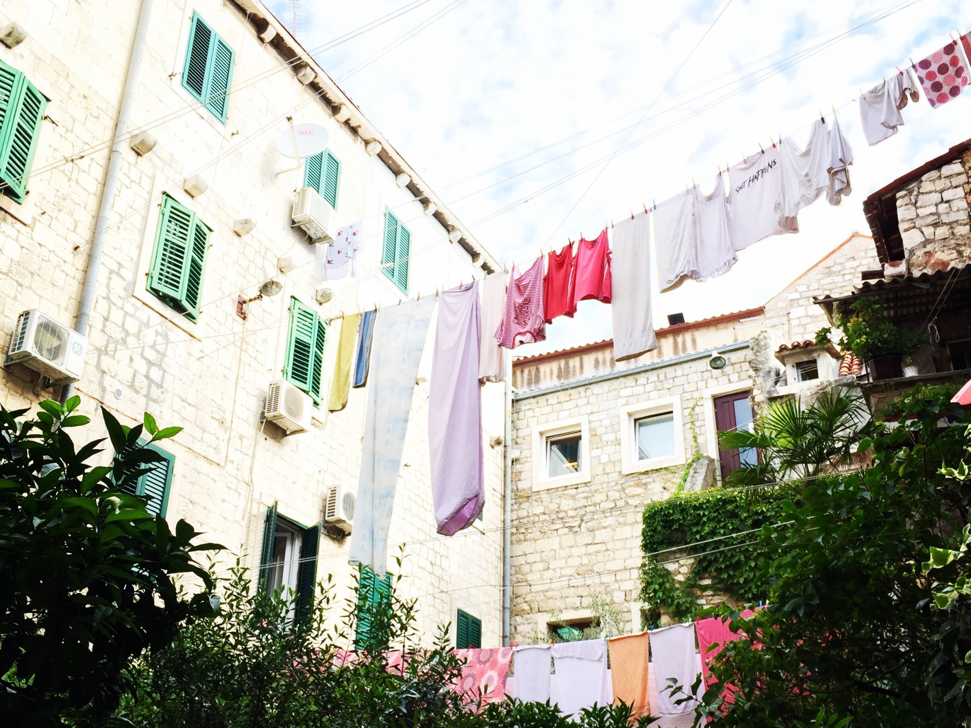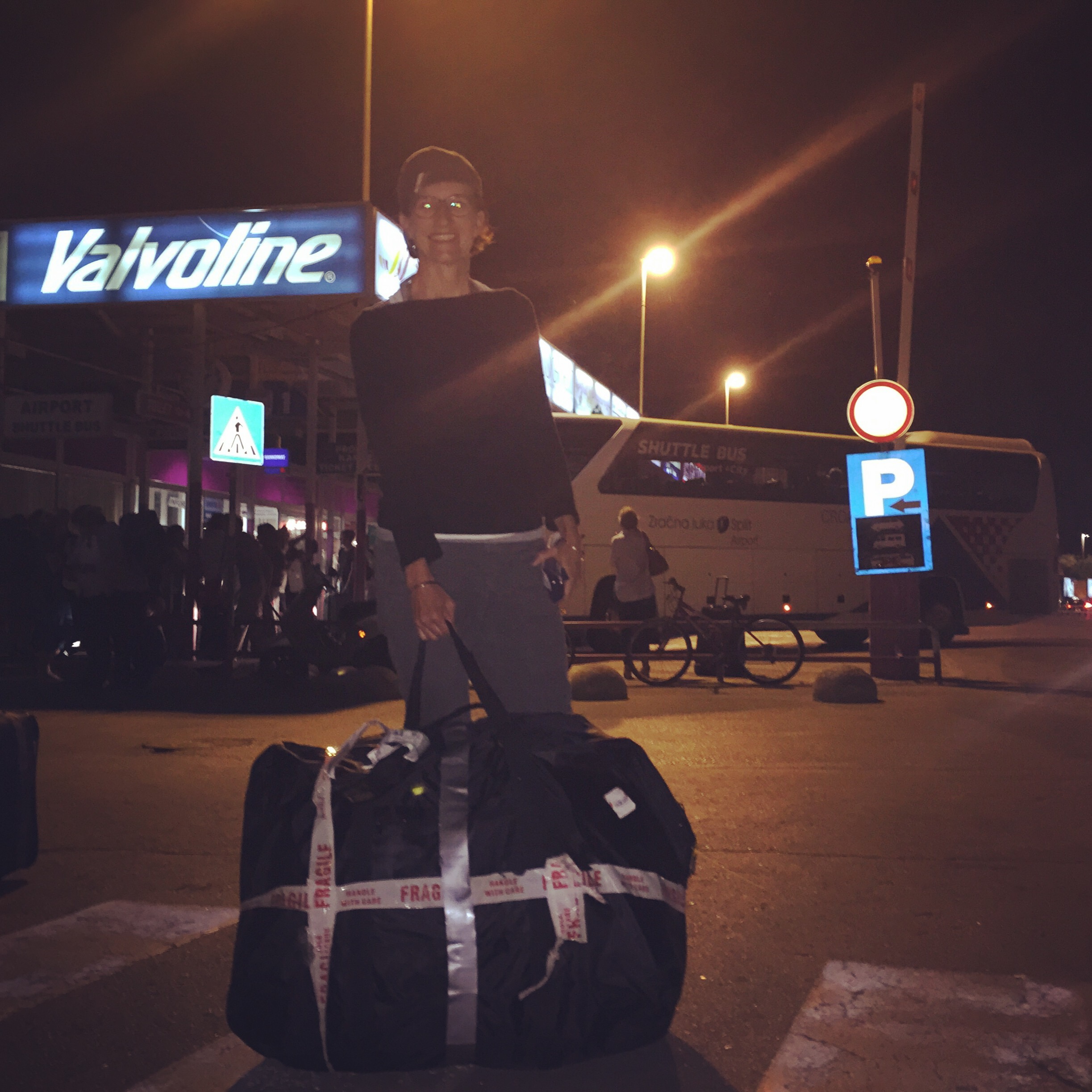The flight from Rome was of course late. So when it finally arrived in Split at 8:30 PM and Dean confirmed that Allegra’s bag was at the Split airport, we were elated. Until he told us that the delivery people had stopped working for the evening, so the bag wouldn’t be delivered until sometime tomorrow. Dean persisted and somehow convinced the airport people to put the bag on an airport shuttle bus into Split, which we retrieved from the bus station at almost 11:00 PM, quite relieved. The bike had, as you can see from the bag, a bit of a rough journey but we put it together and it seems to be OK, except for a small broken bracket for which we improvised a solution but will need to find someone to weld.