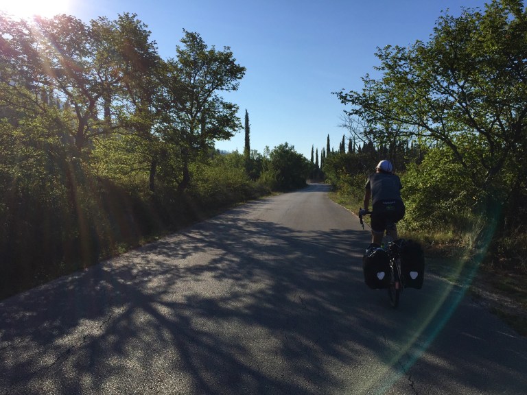 Heading south, with the morning sun already warm on our backs, we climbed into the hills and rode through a beautiful valley filled with old stone homes, fruit orchards and cypress trees. It was pure cycling bliss, the kind of morning that makes you thankful to be alive and we almost effortlessly glided through the gorgeous terrain. The beauty would only increase throughout the day, but the easy miles were about to come to an end.
