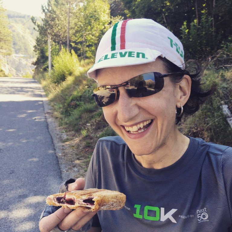 Arriving at the top we celebrated with a delicious pastry. I say “we” in the royal sense, as Allegra almost succeeded in eating my half. Doesn’t she look guilty?