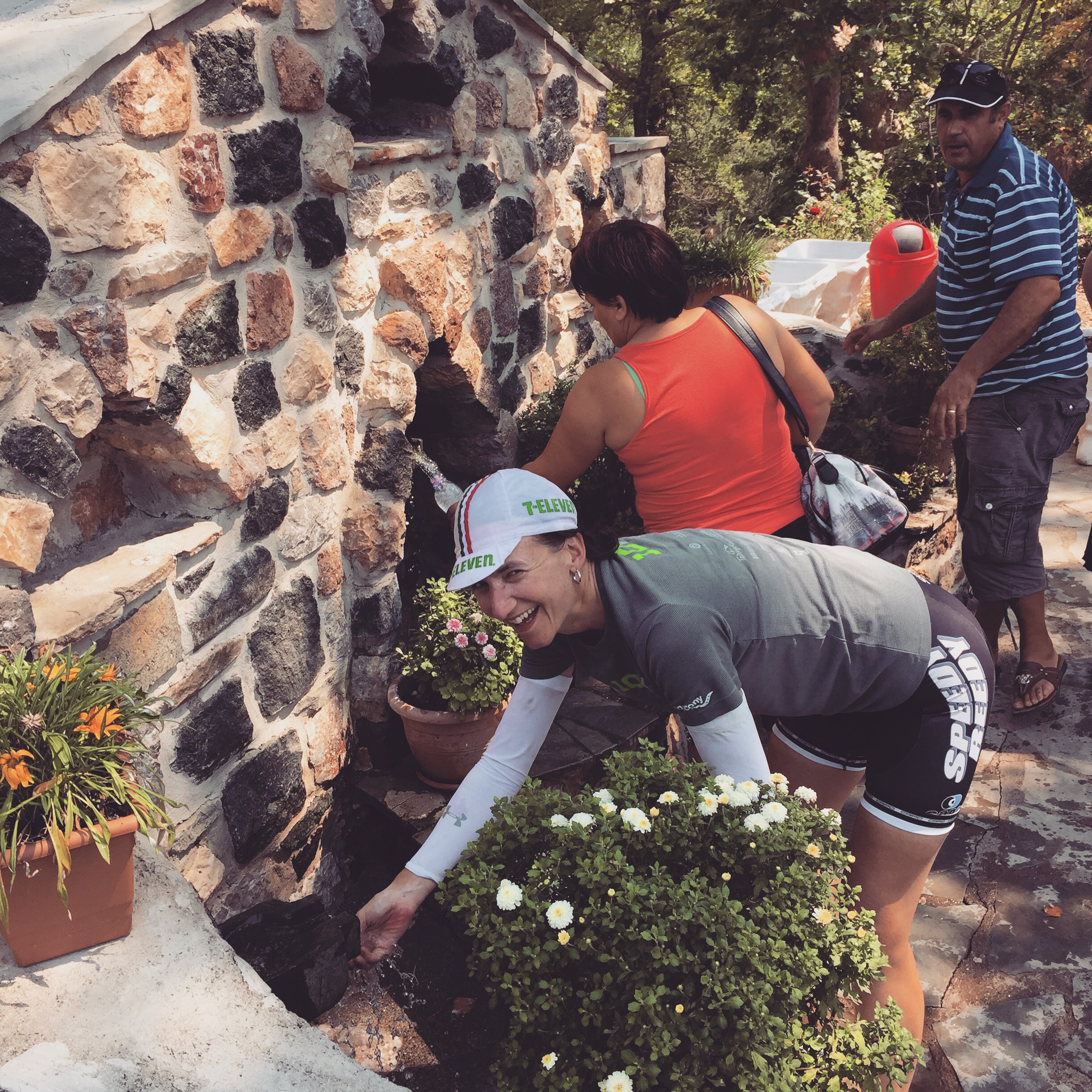 Despite the feast of visual interest, today was another really challenging day of riding, almost 100 miles with very exposed roads, temperatures in the mid 90s, and big hills. All day we worked to stay cool, including a stop at a spring with refreshingly cold water.