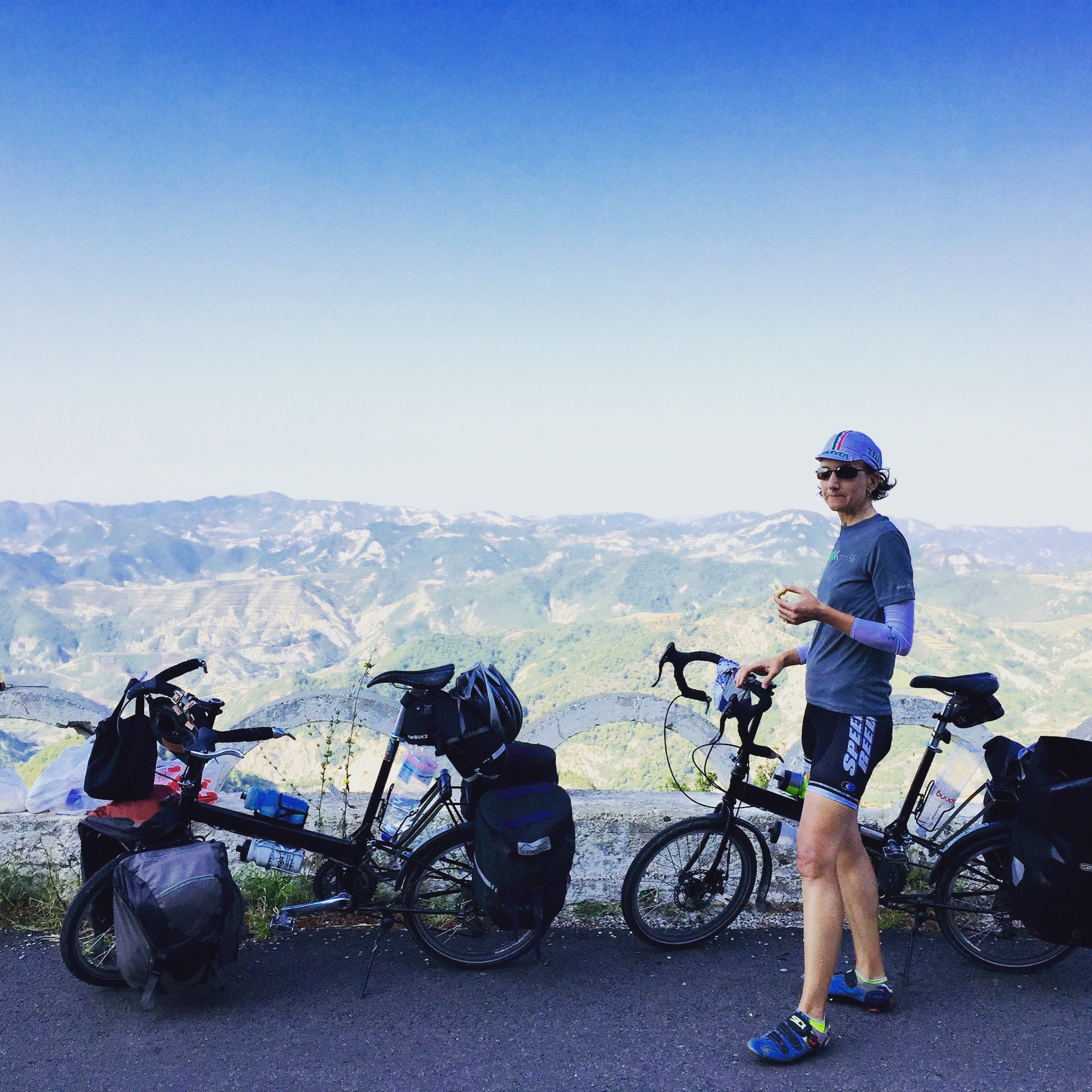 Despite Albania’s (very) rough edges, the people exude a feeling of genuine and almost exuberant friendliness. This was abundantly clear this morning as we prepared to leave our lovely little Art Deco hotel before 6:00 AM and were treated to four cups (two each) of delicious strong espresso by the tough looking (scar under left eye, tight shirt emphasizing biceps) but very kind and inquisitive young man on the night shift. And shortly thereafter, as we were riding out of Tirana, a minibus came towards us, horn beeping repeatedly, on the otherwise empty road. Unsure what was happening, we moved way over and then saw the driver smiling and madly blowing kisses in our direction with a big grin on his face. It must have helped because the first big climb of the day (virtually free of traffic since a new highway bypass tunnel was built) seemed to fly by in an instant, offering great views of mountains, valleys and graffiti.