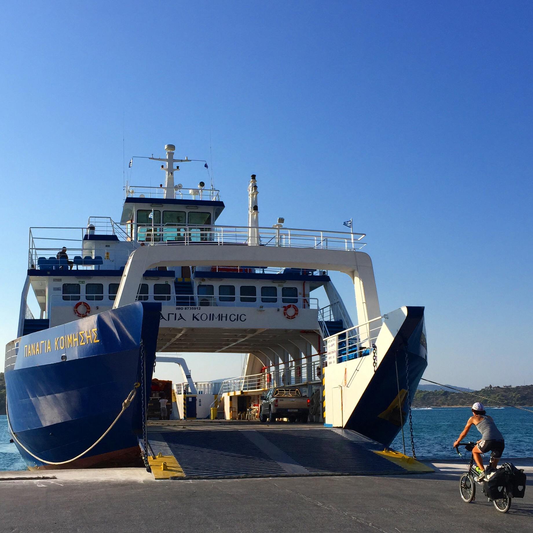 We woke up a bit later this morning, listening to the sound of the waves as the sun came up, enjoying a second cup of strong coffee and a delicious breakfast of thick plain yogurt, melon, bread and honey. Our ride took us along the pretty undulating coastline, across a narrow channel on a small ferry and over the hilly island of Salamina.