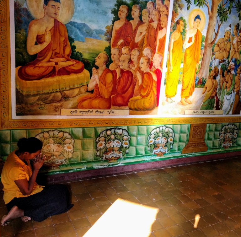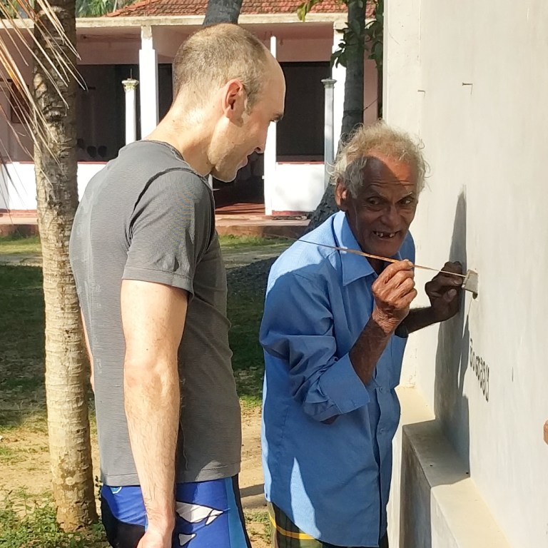 Today, another stop at a Buddhist temple, this one much more subtle but exquisitely painted and very welcoming. We were immediately invited in and shown around by a wild eyed and haired attendant, who helped me push our small donation into the slot with a palm frond.