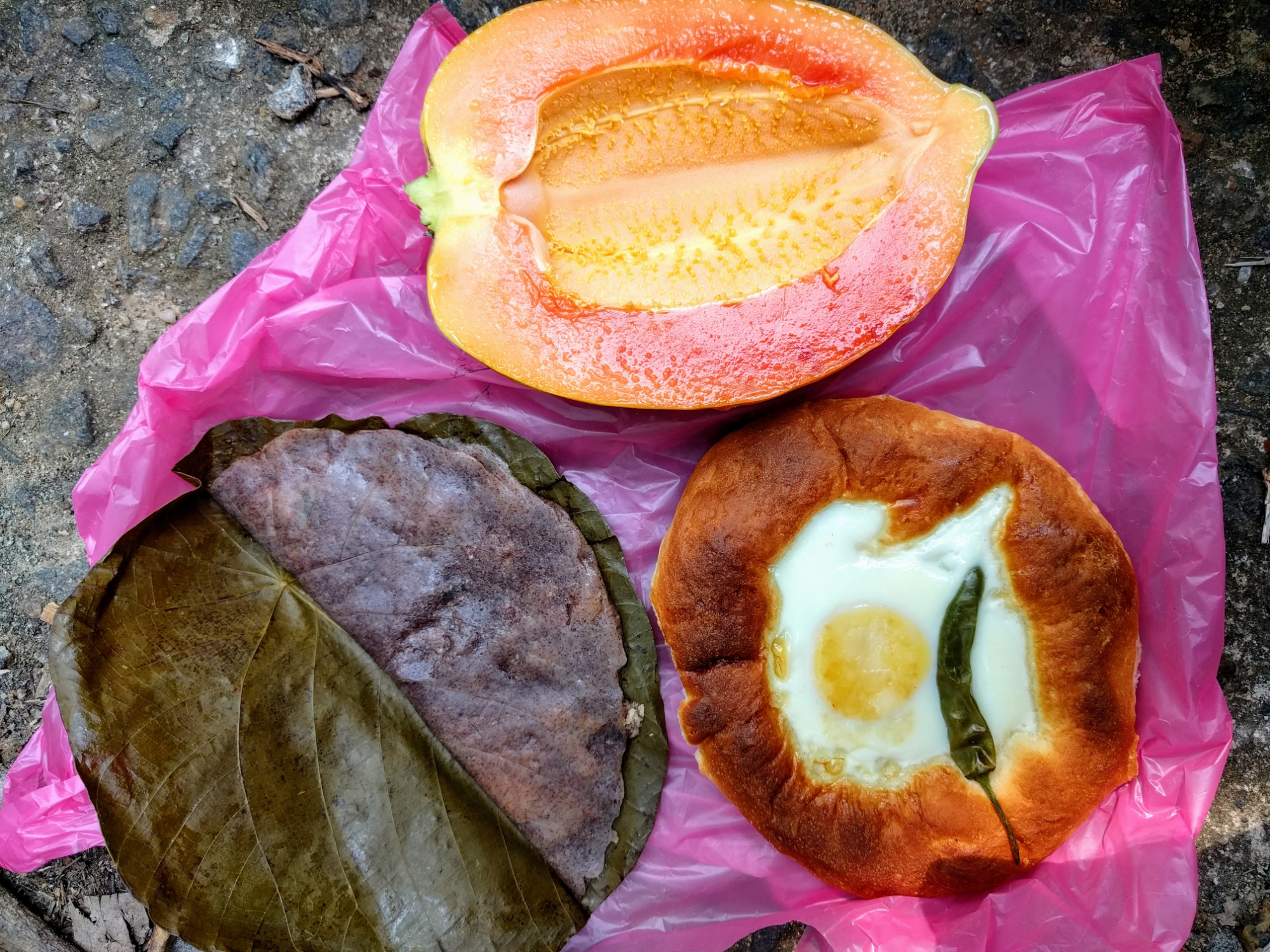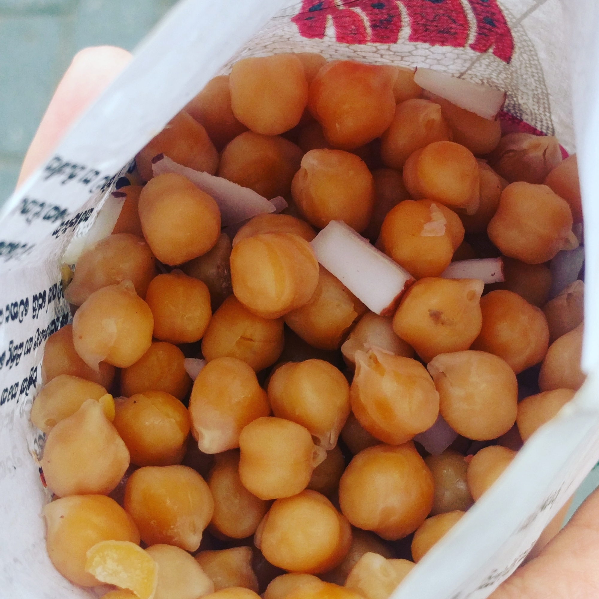 Here’s yesterday’s simple lunch from another small roadside shop: fresh papaya, a chewey bagel type bread with a baked egg and pepper, and a sweet coconut and sticky rice dessert, steamed in a leaf of some sort. And below, a delicious post-ride snack of spiced chick peas with coconut, sold by a street vendor.
