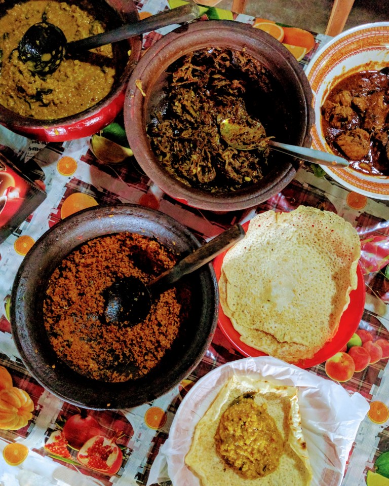 First things first: The food continues to amaze and delight us. The strong flavors of curry leaf, coconut, lime, Maldive fish, chili peppers, and tamarind complement a delicious array of vegetables and each meal seems to consist of five or six different dishes, all served in small bowls with flatbread and rice.Perhaps it’s that riding in the heat all day generates an undiscriminating palate, but neither one of us can recall ever so thoroughly enjoying a country’s food (including Taiwan, our previous culinary paragon). Below is yesterday’s simple breakfast, from a very humble roadside shop in a small town: (clockwise from top left) yellow dal spiced with curry leaves, seeni sambal (a carmelized onion rellish with dried fish, fish curry, appas (aka hoppers, rice flour crepes) and of course the king of Sri Lankan condiments, coconut sambal (shredded coconut, hot chilis, lime juice, salt).