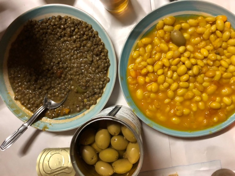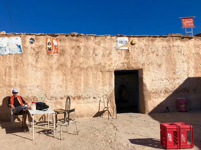 We are beat from a long day of riding and, rather than dwell on our grim accommodations, decide to make the best of it and enjoy a simple meal. We ask the proprietor of the restaurant down below what he has for dinner and, setting down his mint tea and cigarette, he invites us back to his kitchen to inspect what’s on the stove. The lentil and white bean stews look good and he even grabs a spoon and gives us a taste. Accompanied by green olives, fresh bread with olive oil and a sprinkling of cumin and salt, it hits the spot.
