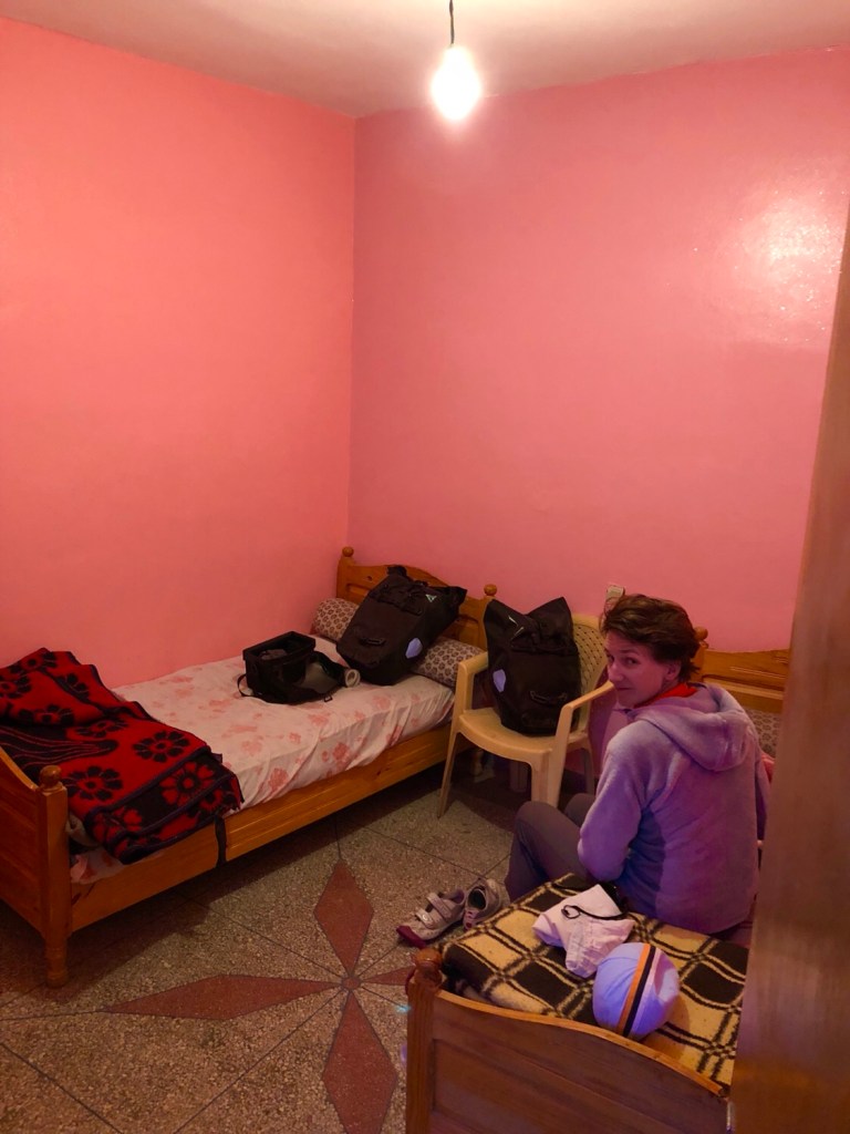 “Its a good thing we have the same sensibilities. There are a lot of couples that wouldn’t be able to survive this hotel.” So says Allegra as we settle in for the night in Ighrem, a small and very humble Atlas Mountain village. We have two choices for hotels and pick the nicer option, but at $7 for the night, we get what we pay for, which amounts to two single beds separated by a plastic lawn chair, a sink that dribbles cold water and has a plugged drain, an exposed light bulb dangling from the ceiling, and walls covered in bright pink paint with a sheen of glitter. Toilet and shower are down the hall, seemingly last cleaned sometime in the 1990s. I am lucky to have such an adventurous and tough spouse.