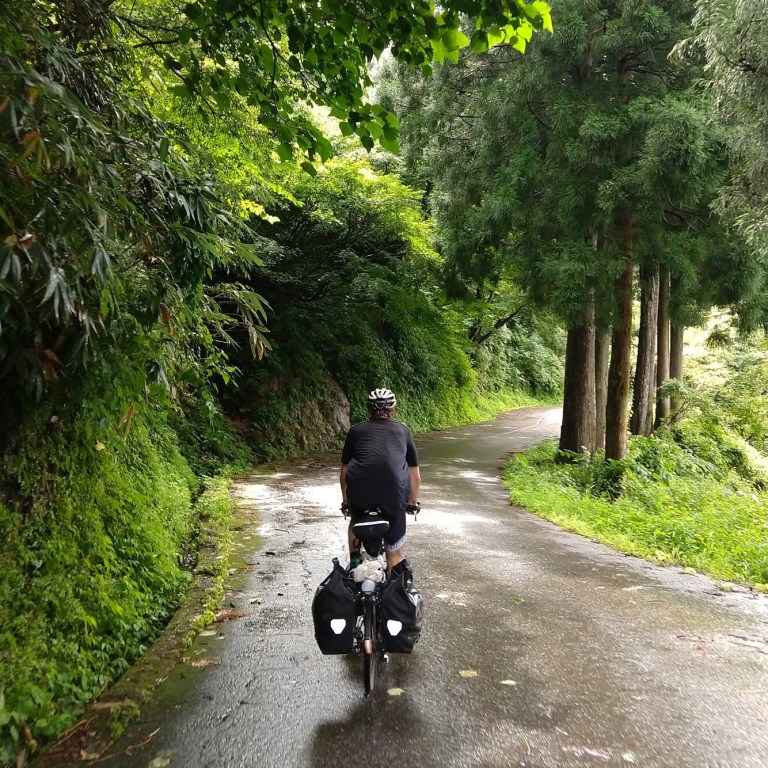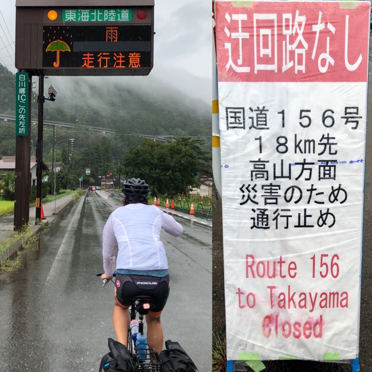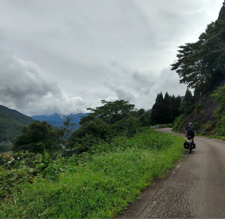 We ride down the Sho River Valley and over the pass at Mt. Takashozu. More rain and mist.