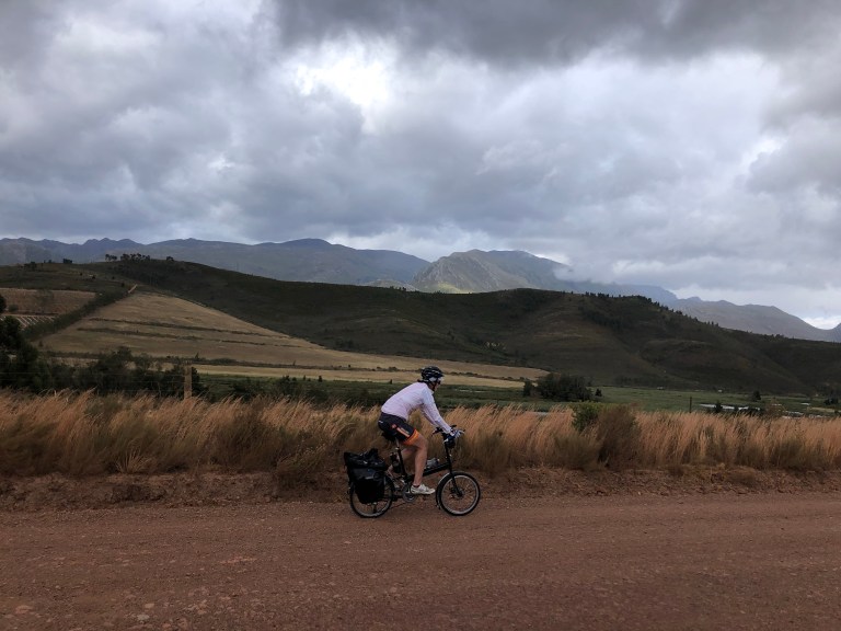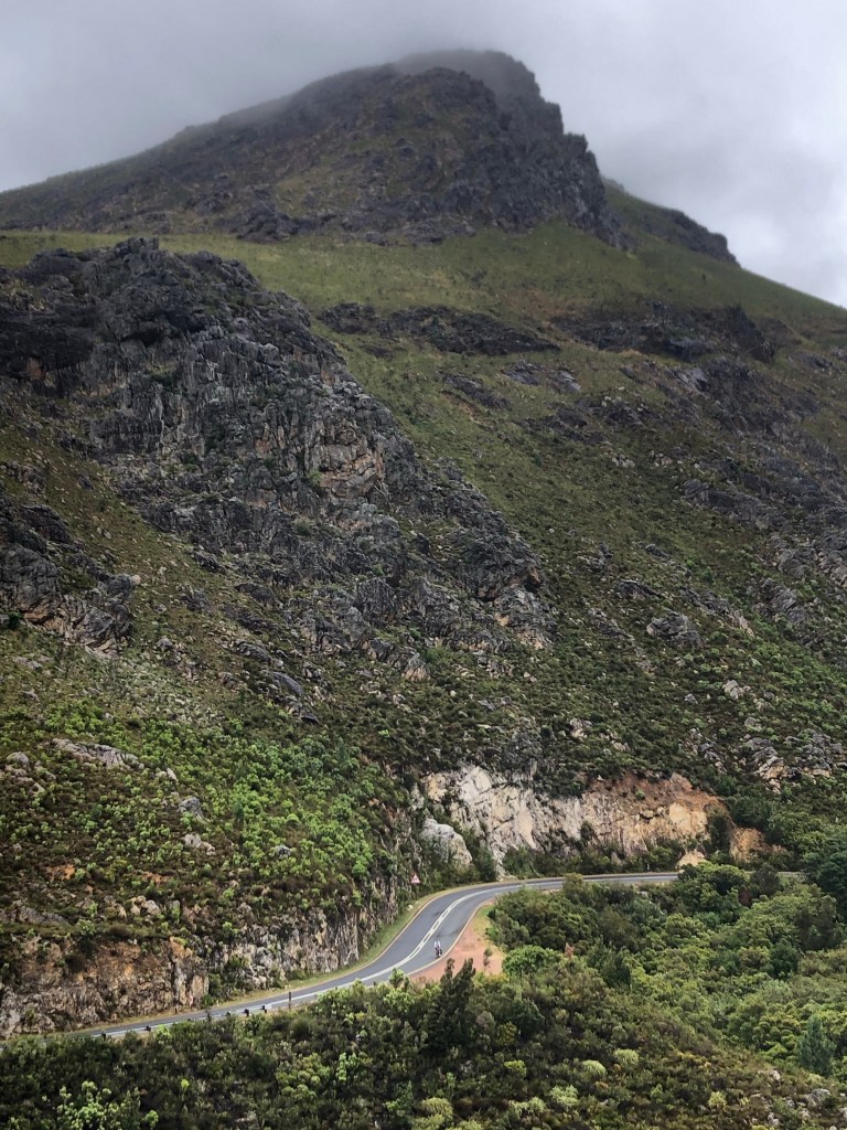 Franschhoek Pass was a long and beautiful climb into fierce winds, which made the descent a bit terrifying for Allegra, with winds whipping up the valley and blowing us sideways.
