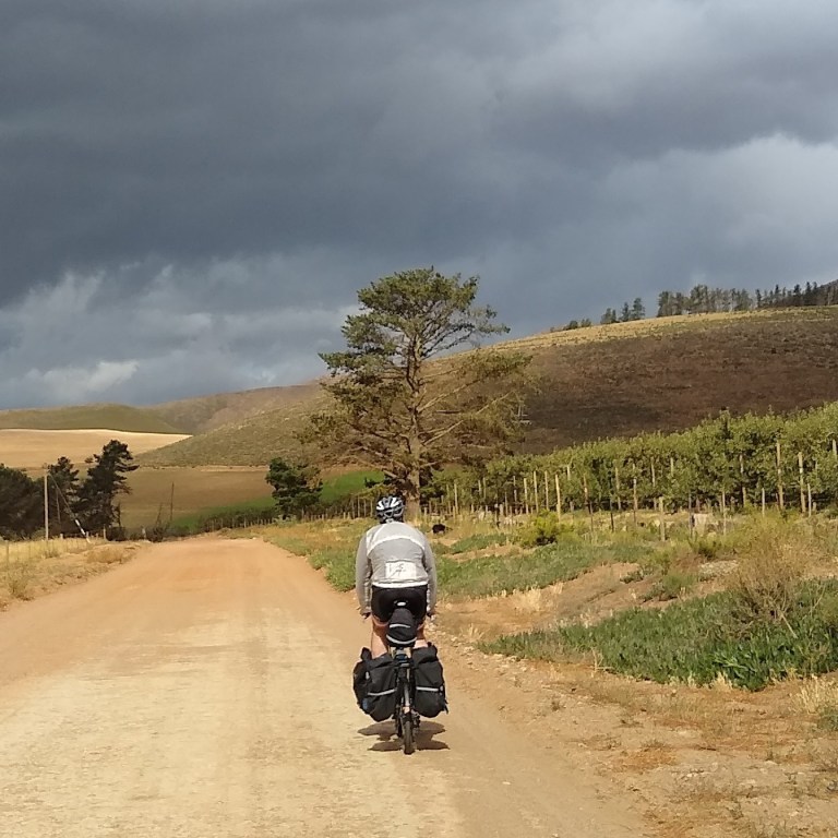 We started the day in Stellenbosch, having gotten a lift out of Cape Town to avoid riding through the notoriously unsafe Cape Flats. The driving rain made it a challenge, but we are used to it and the picturesque vineyards with their Cape Dutch architecture made it enjoyable, especially after learning to look beyond the high voltage electric security fences that seem to surround most of them.