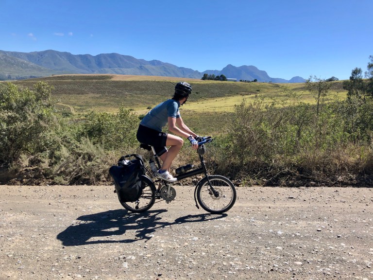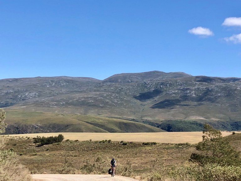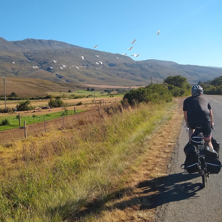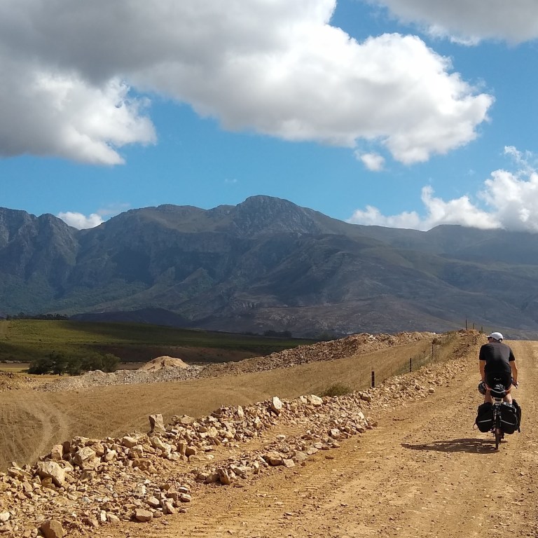The African sky is vast, a deep blue with scattered cumulus clouds that do little to temper the intense dry heat. The mountains of the Western Cape run laterally just to the north of our route and their lightly vegetated and rocky flanks have been a constant companion. The bird life has been amazing: rust colored kestrels, blue cranes with their long fluttering tail feathers, and flycatchers with bright red breasts. And ostriches (on farms) running along beside us! The best wildlife sighting, by far, was a pack of dozens of wild baboons, some massive, loping across a rust colored field. Riding along a dirt road, we noticed what initially looked like big rocks all spring into movement and realized they were baboons, their motion a distinct back and forth rocking that belies their speed. We watched mesmerized until they disappeared into the trees.