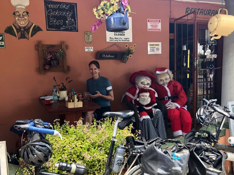 Before today, I would have told you that Greek salad should not contain pineapple. Or apricots. And I also would have told you that only a fool would order Greek salad off an Afrikaans menu in a one-restaurant town in rural South Africa. Turns out I was wrong on both counts. After a hot morning riding along dusty gravel roads through dry scrub and farmlands, South African Greek salad was delicious, especially eaten al fresco and in the company of large format Christmas dolls.