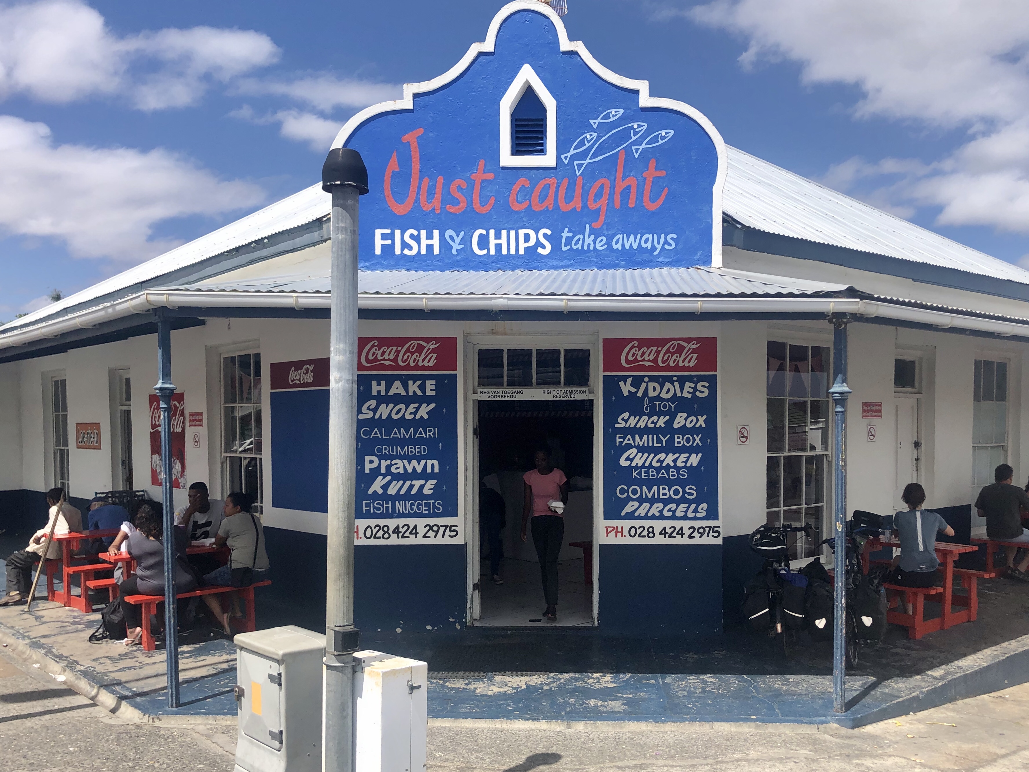 Earlier in the day, approaching Cape Agulhas, the southernmost tip of Africa, we rode through some of the most wide open landscapes we’ve ever seen. Vast sky, unobstructed horizon and many miles of road inspired lots of thoughts, ranging from: (a) the essential characteristics of a satisfying and fulfilling career, to (b) a trans-African bike tour from Alexandria to Cape Town, to (c) dang a Ruben sandwich with a pickle would taste amazing right now. The Ruben never materialized, but in bustling Bredasdorp we did find a great fish and chips joint, packed with locals. As advertised, it was just caught, and doused with salt and vinegar it was delicious.