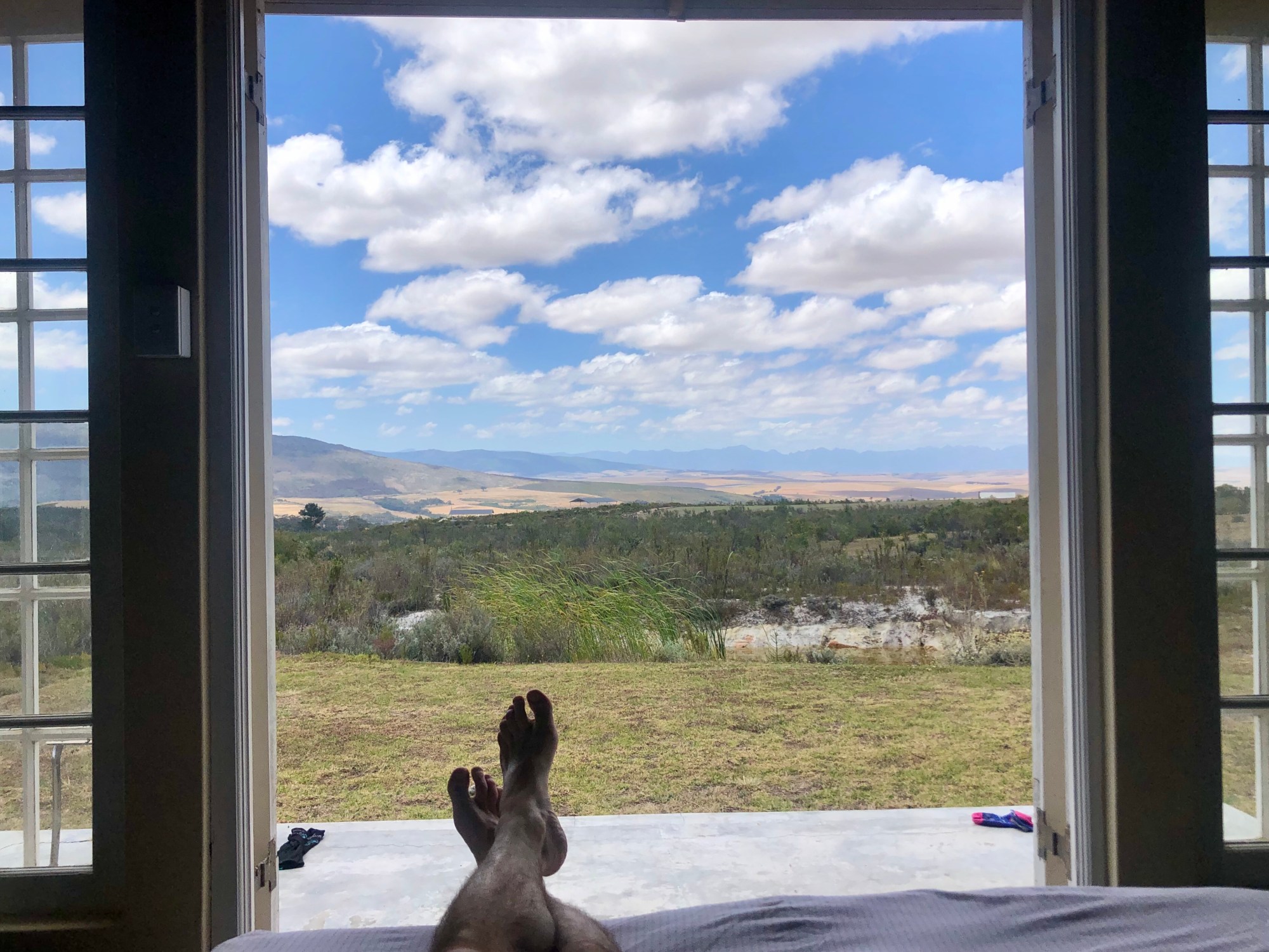 In truth, the area is a gorgeous valley surrounded by mountains and at the end of the road (up a steep and even bumpier driveway) we were welcomed with open arms and cold drinks by Anni, a dear and longtime friend of Allegra’s, and her partner Kelli. I’ll simply say that these two are among the most interesting and enjoyable people I have ever had the pleasure of meeting, with vast and worldly life experience, kind hearts, and an astonishingly productive little farm from which they prepare ridiculously delicious food. We cleaned up in an outdoor shower, snacked on home grown and cured olives and peppers, drank chilled local white wine, went for a walk with their dog Rabbit and had a fabulous South African braai (barbecue) with homemade hot sauce made with peppers from the garden. We chatted and laughed into the warm evening and as the sun set against the Langeberg Mountains in the distance, the moon and stars of the Southern Hemisphere slowly emerged, eventually blanketing the sky. We spent the night in a sweet guest cottage and slept with the double doors wide open, looking up at the night sky and listening to bullfrogs.