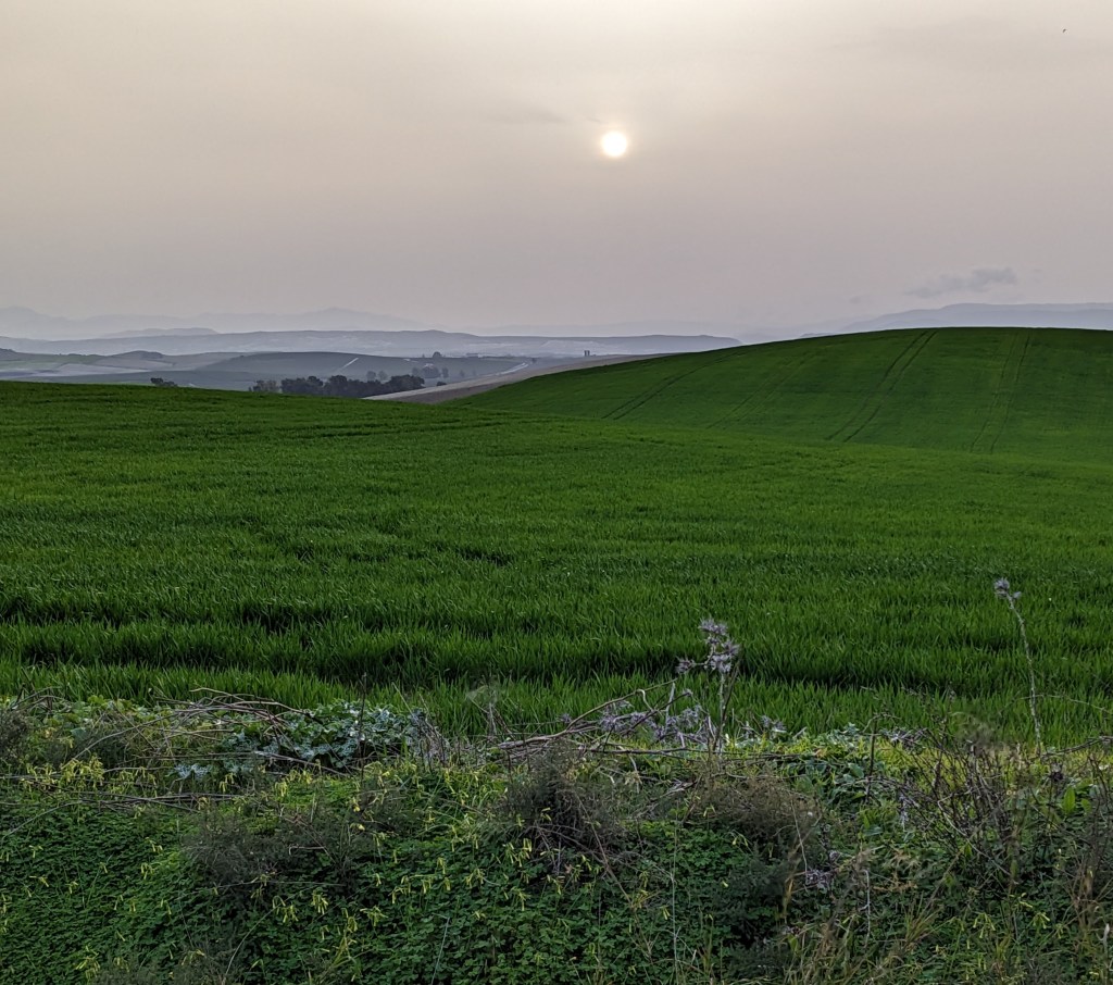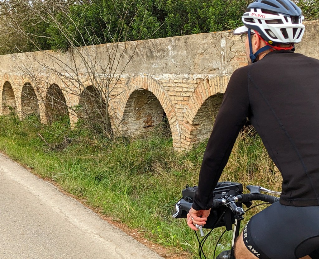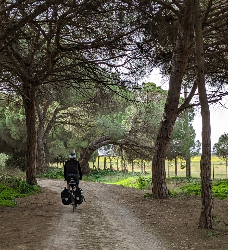 We are out of the Sierra Nevada foothills now and headed east, towards the Atlantic, and we feel the humidity and wind. The flora changes too, blossoming almond trees replaced by umbrella pines and beautiful smelling white flowered broom plants lining the route. Eventually we join a gravel path that takes us beside farms, into the suburbs and eventually to a large protected estuary south of Càdiz.