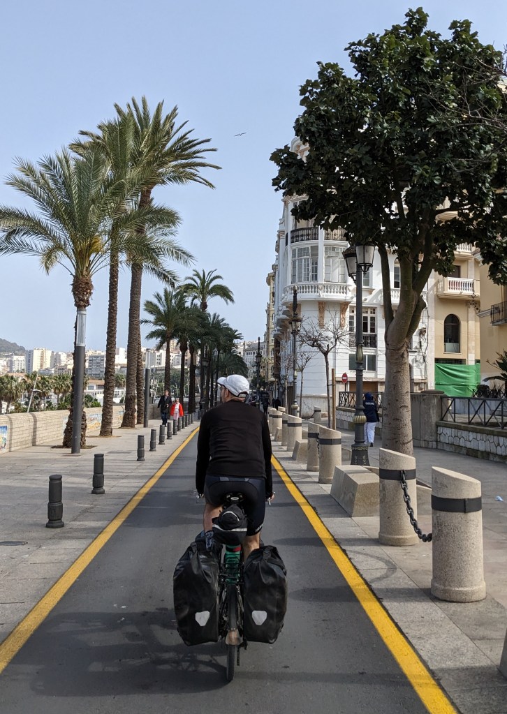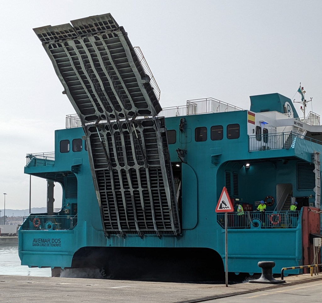By noon we arrive in Algeciras, the Spanish port city adjacent to Gibraltar. In addition to being a busy container port serving the Mediterranean, there are passenger ferries to a number of North African ports, leaving almost on the hour. We buy tickets to Ceuta (bikes travel gratis) and watch a theatrical disembarkation of our boat when it arrives. Despite a dozen employees directing traffic, someone has parked a small van directly where the boat unloads and is not to be found. Lots of shouting and hand waving ensues, but somehow the 18 wheelers navigate around it as they back up off the ferry.