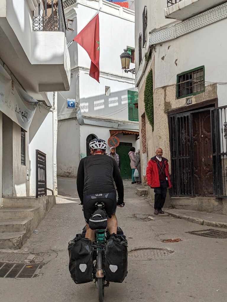 We make it to Tetouan by early afternoon, and, after riding through the steep, narrow and winding streets of the walled old town, find a hotel at the gates of the historic medina. A shower and delicious lunch of roast chicken, olives, salad and rice revives us and we set off to explore.