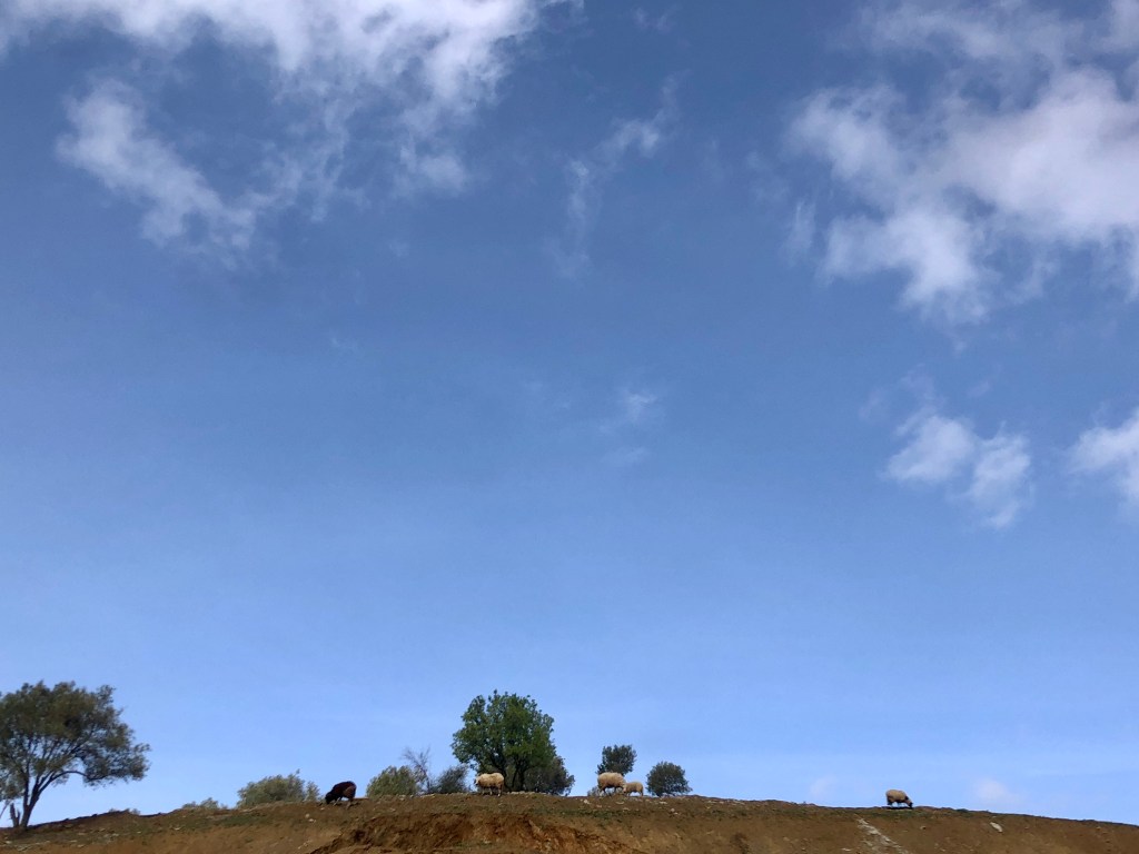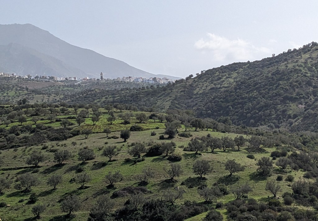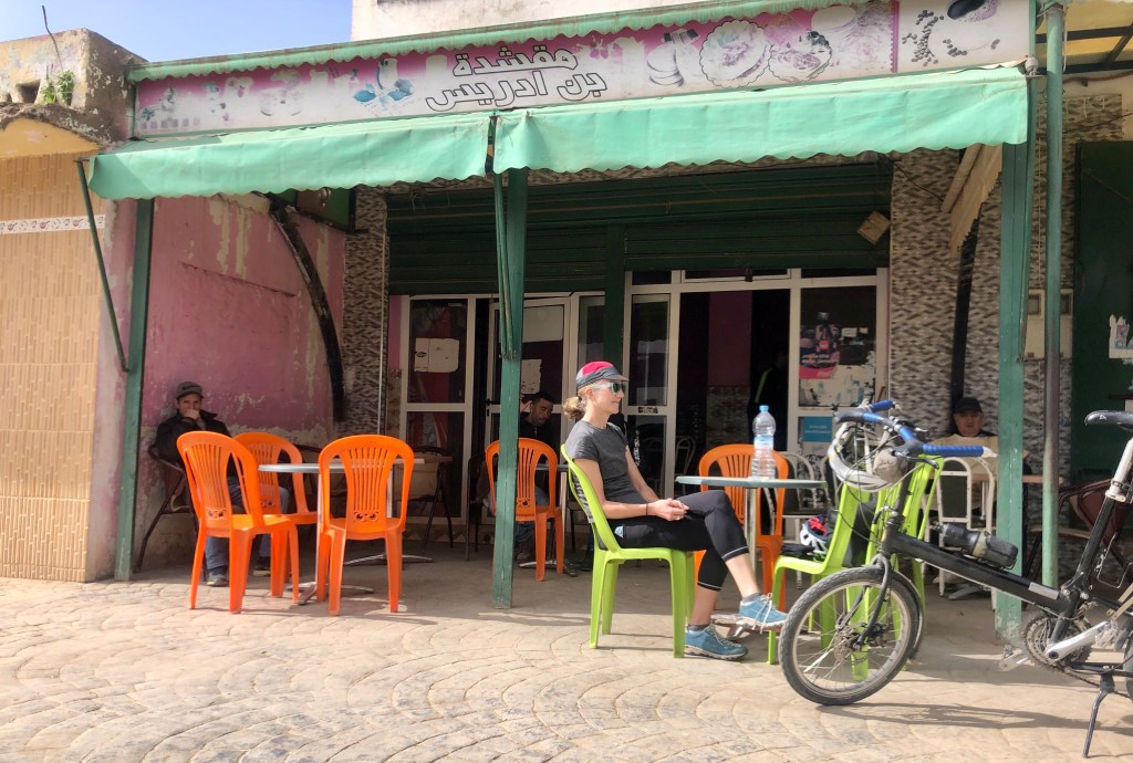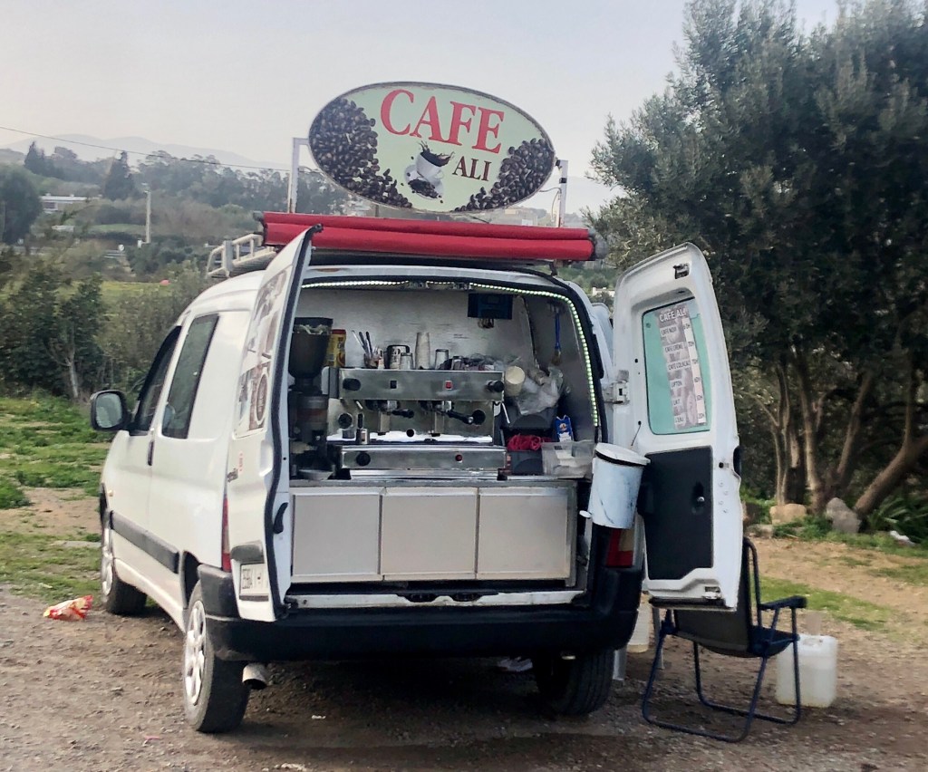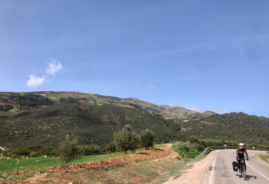 Leaving Tetouan, we see the layered Rif Mountains in the distance, today’s destination. The north of Morocco is surprisingly green, with pine forests and olive farms, unlike the Atlas Mountains and Sahara Desert of southern Morocco, where we biked five years ago. As we ride, we see a number of lakes and reservoirs and small farms on the hillsides, sheep, goats and cattle grazing and raptors overhead. We also pass a small truck that has been converted into a mobile espresso stand. Brilliant.
