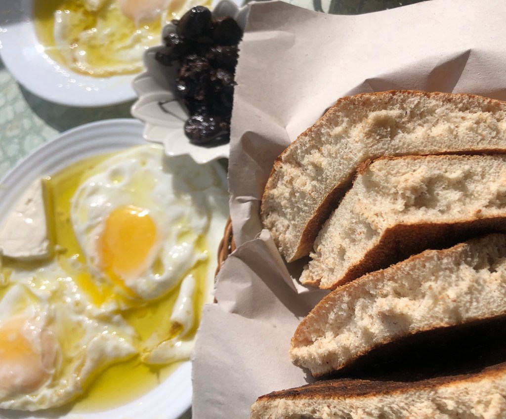 Coffee and eggs are all that’s offered and they are delicious, served drizzled with (bathed in?) olive oil and served with fresh bread, a bit of cheese and herbed black olives.