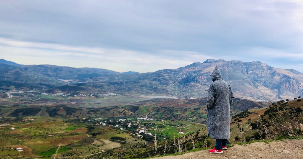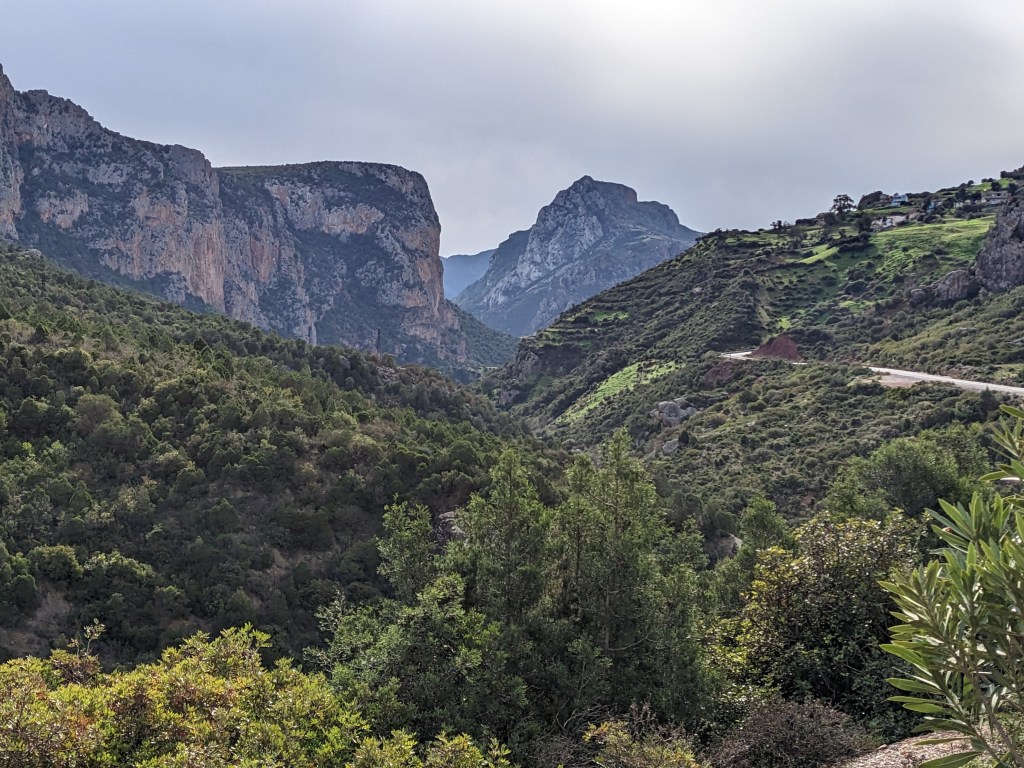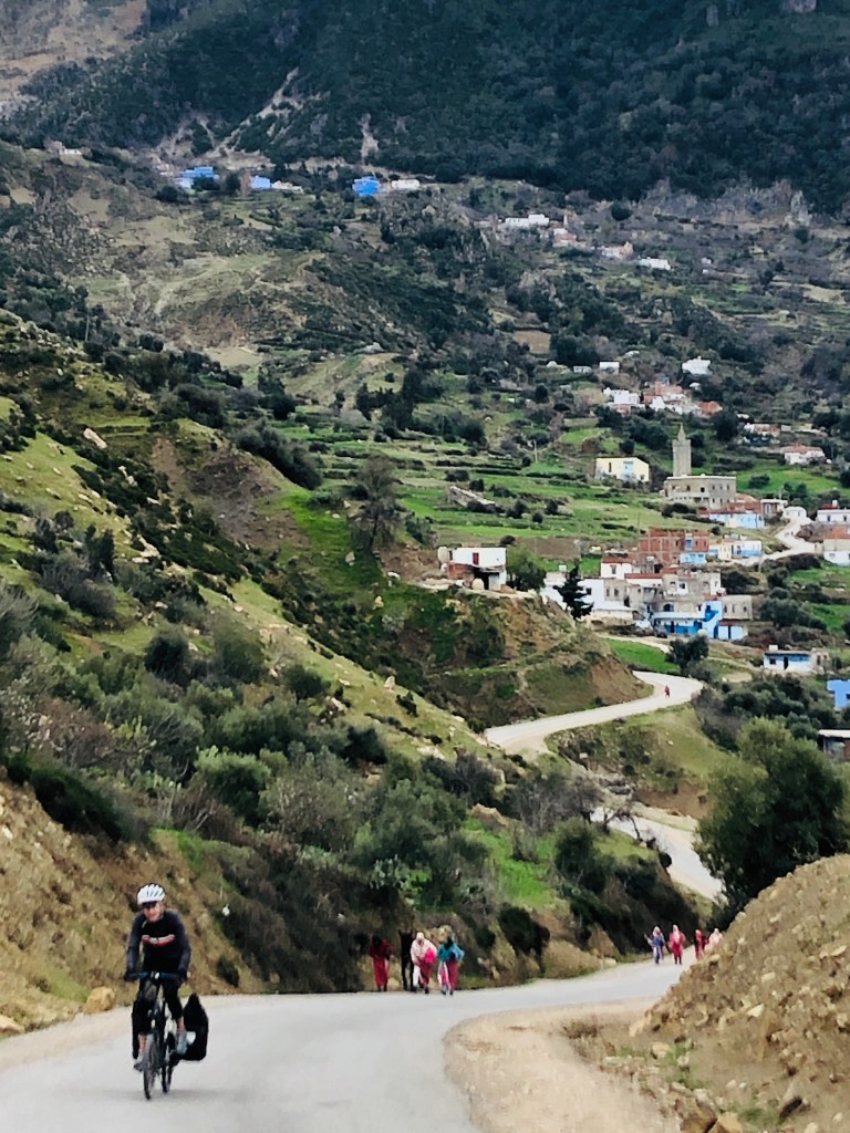 Beyond the dump, a steep and narrow road takes us into the mountains above Chefchaouen, climbing over 1,000 feet in under 3 miles. Almost immediately we are in the countryside, with views of Rif Mountain peaks and green valleys. On the road we see primarily women walking to get firewood and water and young men grazing sheep. We even pass a smiling young girl, at most 5 years old, wearing a crown of dried figs and playing by the side of the road. It’s enchanting.