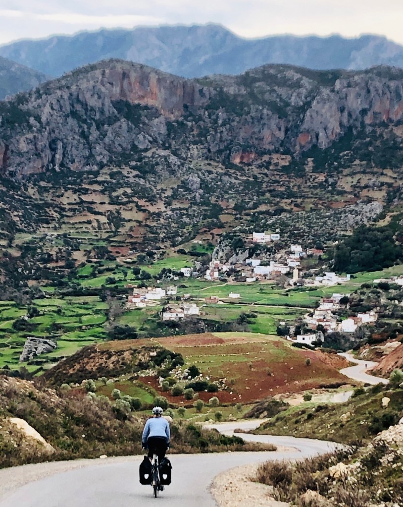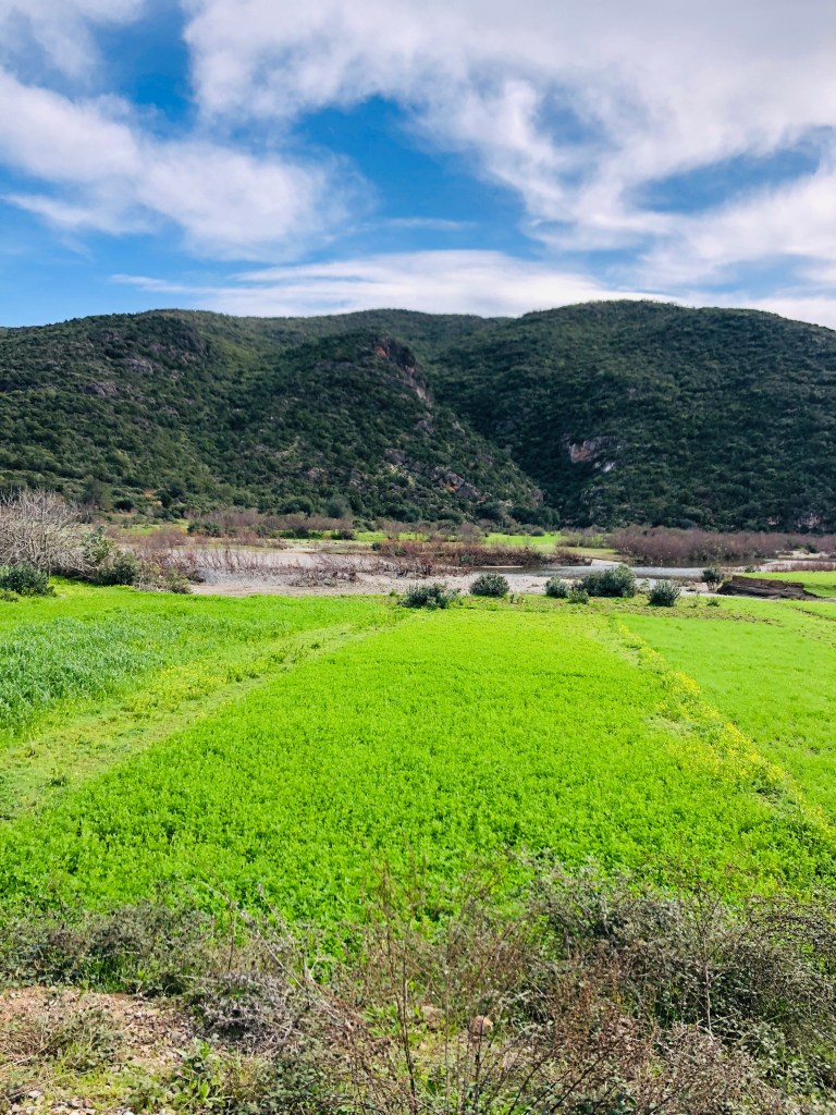 A steep descent takes us to the Oued Laou river valley, where massive red walls of rock rise above us. It is stunning scenery, reminiscent of the majestic canyons of the American Southwest in early spring. Further on, as we follow the river towards the Mediterranean, a rich agricultural valley emerges and we pass wonderfully smelling fields of mint and roadside shrubs we realize are lavender in bloom.
