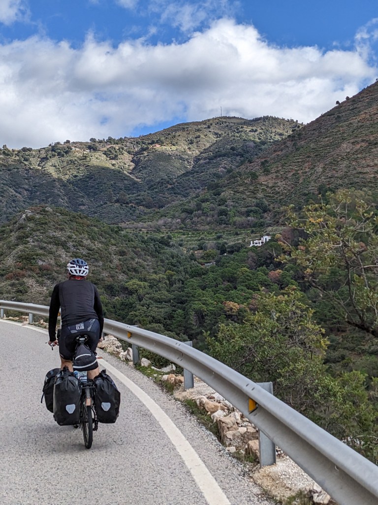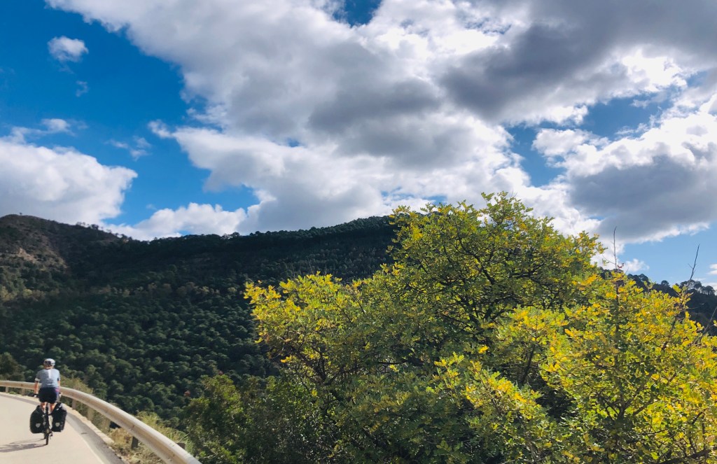 The following morning, we depart Estepona refreshed and sated, having done a number on the lovely breakfast buffet. They clearly didn’t bargain for two hungry cyclists. We continue along the Costa del Sol, where we see lots of cyclists out for Sunday rides. At Marbella, we head inland and up into the Sierra de las Nieves national park, which contains the largest remaining Spanish Fir tree forest. It’s a long and steep climb from the seaside into the mountains, but the road is magnificent: narrow and winding through pretty forest and small towns, with views back to the Mediterranean. We see deer and lots of mountain bikers.