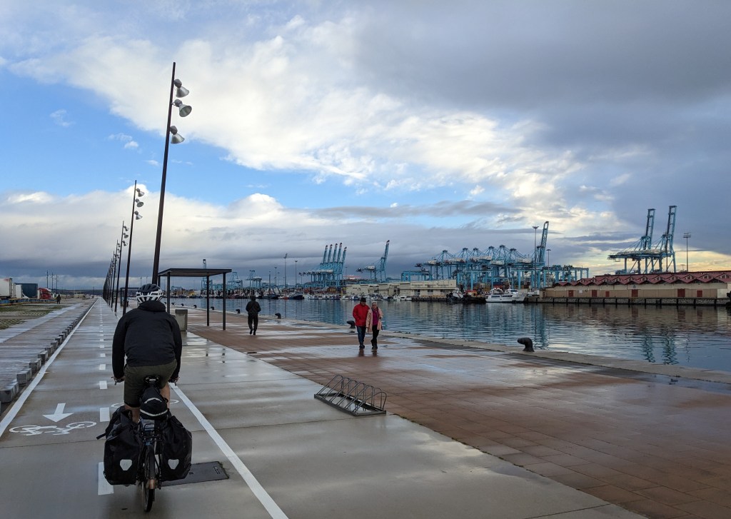 It rains overnight and as we set off from Algeciras there are threatening clouds on the horizon. We take the bike path next to the port and find that despite the blue collar working vibe of Algeciras, there are lots of bike paths and very livable neighborhoods.