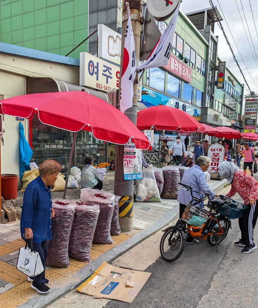 We stop in the small town of Yeoju for lunch. At a farmers market we see large bags of dried peppers being sold.