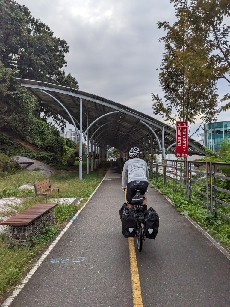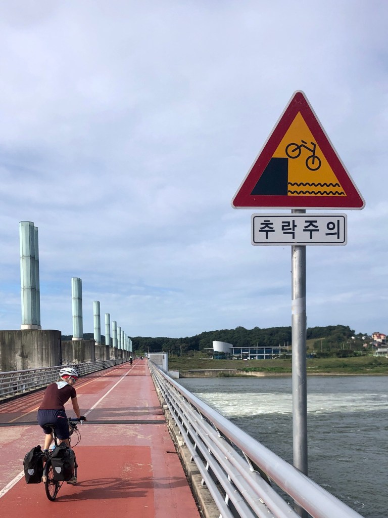 We are now well beyond the Seoul metropolitan area, heading south following the Hangang River. It is one of the four major rivers we will ride along on the appropriately named Four Rivers Trail, a bike path that runs the length of South Korea from Incheon to Busan. The route is great, mostly separated bike paths along the river banks and occasional sections on quiet roads. The river crossings are often atop the many large dams that control the flow of the river, especially during the rainy season when torrents of water flow down from the mountains and the river volume is much greater than today.