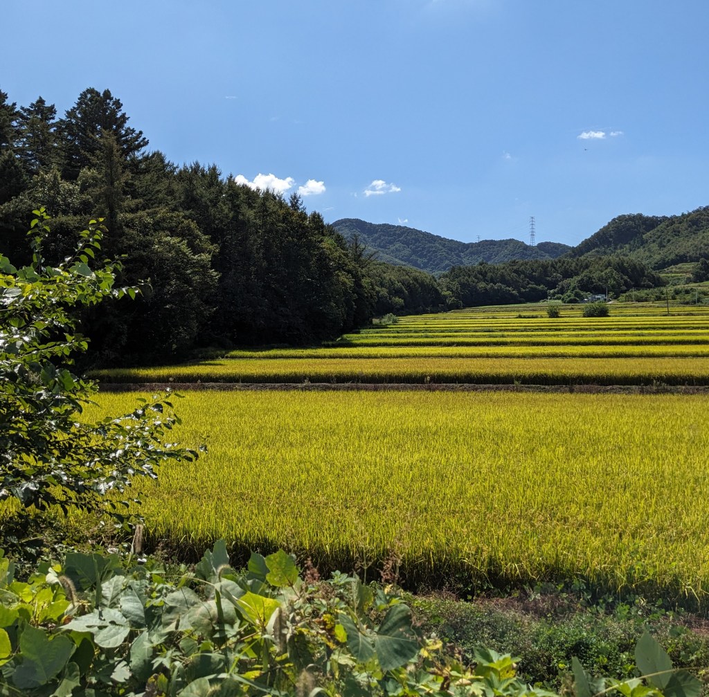 Outside of the small towns, the river is quiet and the banks lush, supporting abundant bird life. White egrets fish in the shallows and occasionally fly off squawking in a prehistoric sounding way. We pass small farms and gardens, many growing bright red gochugaru peppers, squash and cosmos flowers. The rice fields have a rich golden green hue and are ready for harvest.