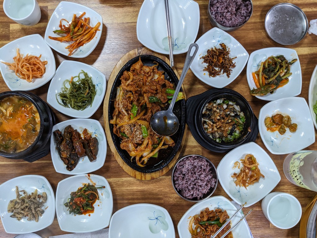 By mid afternoon we arrive in the small village of Donsan-ri, known for its hot springs. Given the heat and humidity, we opt for a cool shower at our hotel, an incongruously modern place with a self check in kiosk and toilets with more control settings than your average car. Eventually we wander out to the village’s one street for dinner and end up at a small place run by a friendly couple. We sit down, smile and the food just starts arriving; an incredible assortment of small side dishes called banchan, tofu and black snail soup, and a plate of sizzling thinly sliced pork and green onions accompanied by a mounds of fresh lettuce and kkaennip (perilla leaves, which taste like a cross between mint and basil) used to wrap the meat. It was an astonishingly delicious end to the day.