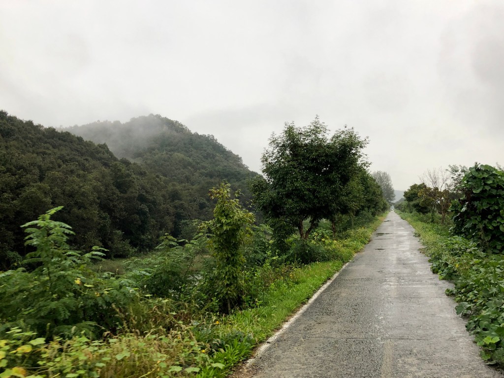 As we begin riding, we notice that the rain amplifies the rich smells of forests, farms and orchards we pass. The lush vegetation has many shades of deep and glossy green and the surrounding hillsides are shrouded in mist. The birds seem happy with the moisture, especially the highly vocal magpies whose distinctive chatter we hear frequently. We pass small persimmon and apple orchards, the persimmons recently picked and the apples large and near harvest.