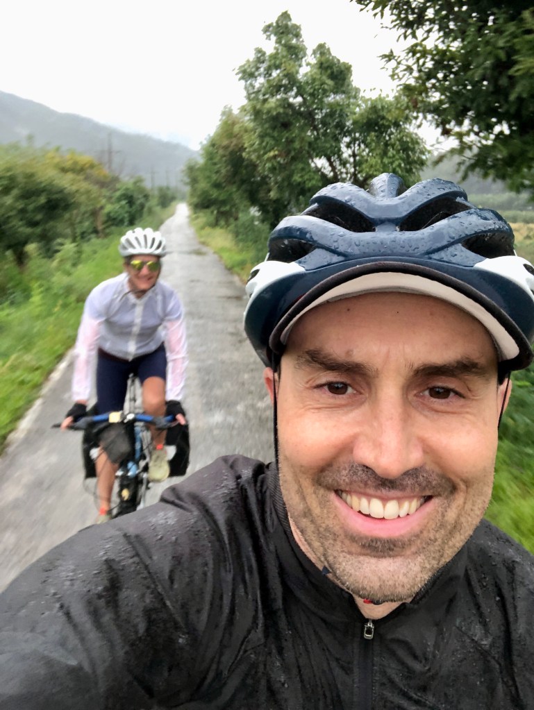 As we ride towards Mungyeongsaejae Provincial Park, we have one more serious climb. As we approach the bottom, we see other cyclists and exchange words of encouragement. A pair of hardy old Korean men, one red faced from exertion and cycling with his jacket open, exposing a bare chest, give us an especially enthusiastic, almost primal sounding cheer – “HEYYYYEAAAAAAAIII”. Along the climb, we slowly pedal into a pine forest and by the top we are enveloped in mist. I imagine that on a clear day the views would be outstanding, but today it’s a sheet of white. We are soaked and tired.