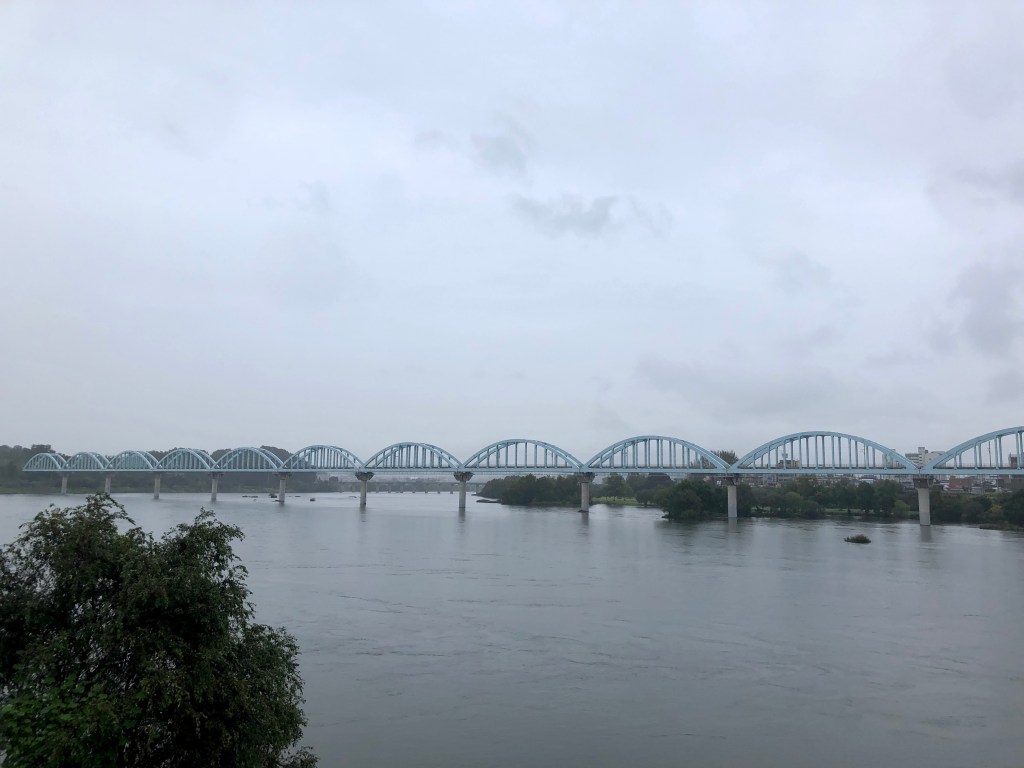 In Chungju, we make a wrong turn and end up on a multi-hour detour that takes us on a long and steep climb into the mountainous Gyemyeongsan Forest along the Namhangang River, with views of the forested peaks of Waraksan National Park and eventually the massive Changju dam. It’s beautiful but also pouring rain. Using cell phones for navigation presents a major challenge in the rain and we get turned around trying to find our way back to the Four Rivers trail and continue climbing along the river above the dam and eventually circumnavigate the entire Gyemyeongsan Forest. We are drenched and tired from the extra climbing, but we’ve been through this sort of ordeal many times and we regain the trail three hours after our wrong turn. Allegra’s cell phone appears to be a casualty of the rain however.