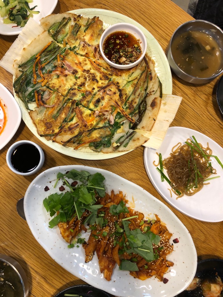 We make it to the little town outside Mungyeongsaejae Provincial Park an hour later, find a comfortable hotel and enjoy hot showers. We string a clothesline up in our room to dry our stuff and head out for a well deserved meal. We are not disappointed. At a family run restaurant that has been open since 1974, we eat a delicious meal of green onion and octopus pancake, grilled deodeok (the root of the purple bonnet bellflower), glass noodles and fresh herbs. It tastes miraculous.