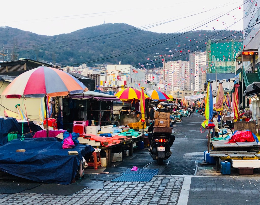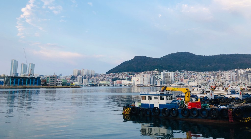 The massive fish market is just coming to life as we ride our bikes out of Busan. This is a working market, housed in a modern three story building on the waterfront and in small ramshackle storefronts spilling out into the street. The cobblestones are wet as vendors hose down sidewalks and the smell of fish and other sea creatures – live, dead, dried and fermented. – is bracing. Upwind of the market, the harbor is wonderful at this hour, with the sun coming up over the buildings, illuminating the hills surrounding the city.