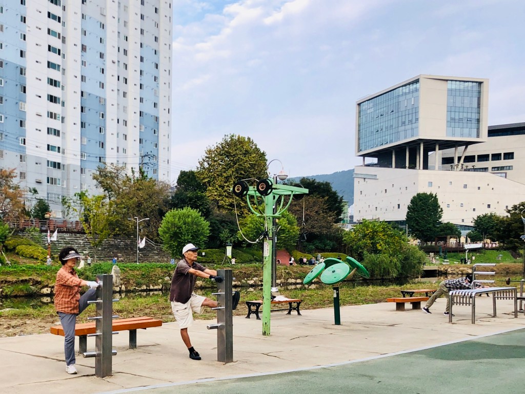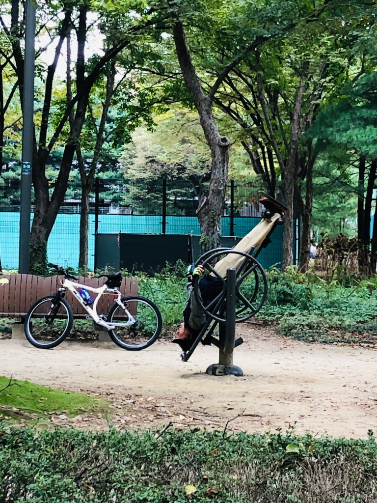 We spend the next hour and a half riding clear across Busan to the bus station. Along the Suyeong-gang river, we are again amazed at the number of people using the great trails to cycle and and walk and the public infrastructure for calisthenics, badminton, stretching, rollerblading, and countless other activities. There is so much life on the streets here.