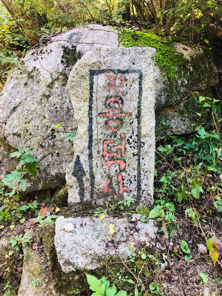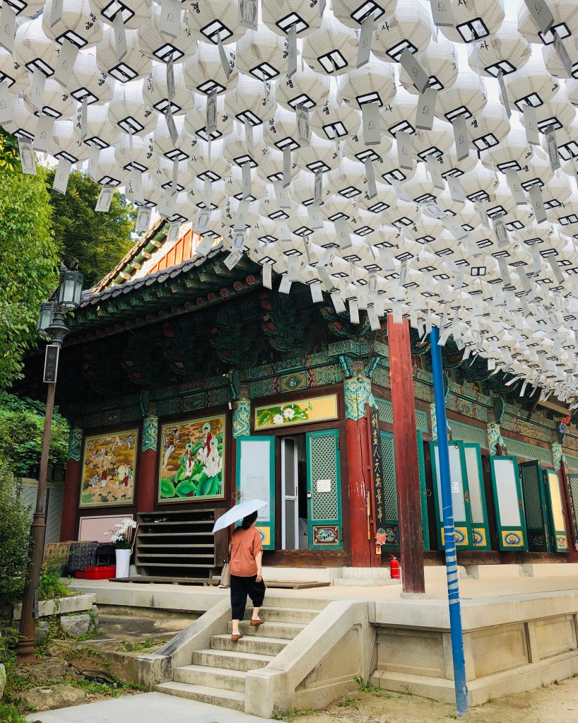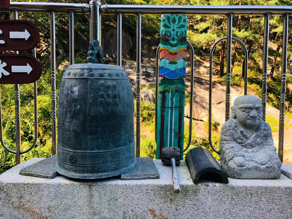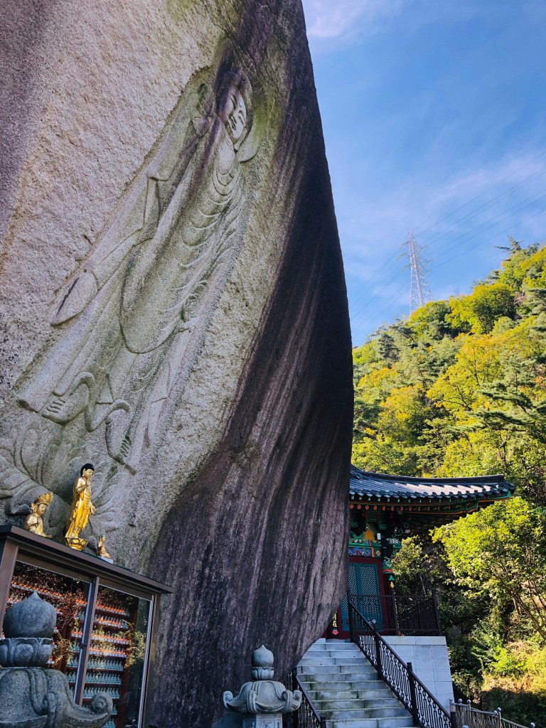 We continue hiking on to Yongdeoksa Temple, nestled in the forest next to the national park. It is much humbler than Bongeunsa, a small Buddhist temple and living quarters for the resident monks surrounded by trees with a beautiful carving of the Buddha on a massive slab of granite and an adjacent shrine and meditation cave. We are the only people there and the quiet, as we sit and watch the trees, is magical after the earlier crowds.