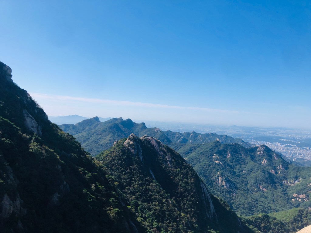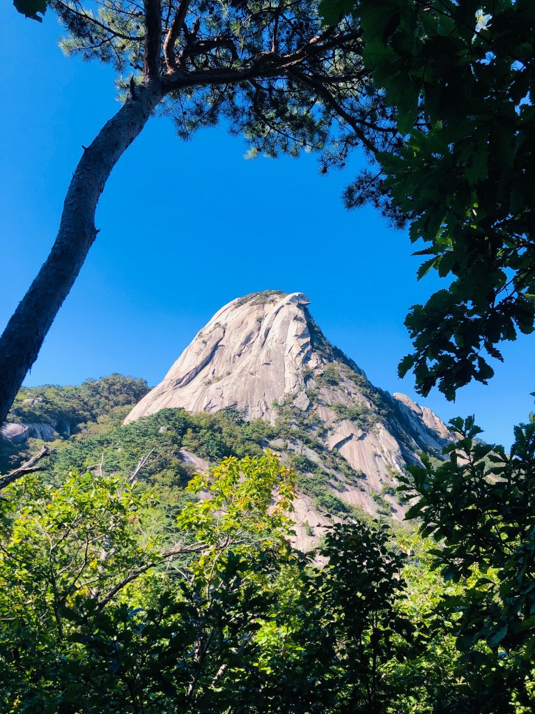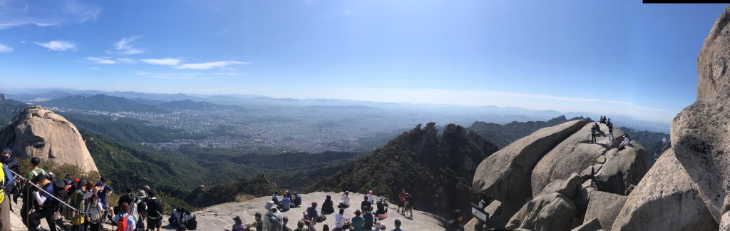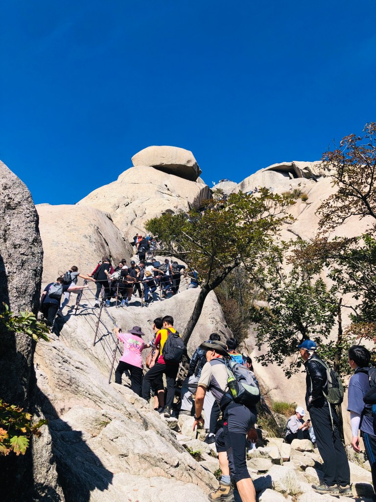 The next day, we wake early and head to Bukhansan National Park, the only national park within the city limits of Seoul. Amazingly, it is accessible by subway, and when we emerge from the last station we are less than a kilometer from the park gate and trailheads. The trail to Baegundae, the highest of the three monolithic granite peaks in the park, climbs from just above sea level straight up to 836 meters over 4 kilometers. Steep, in other words. And, on this sunny holiday, crowded. And by crowded, I mean a line hundreds of people long waiting patiently to take photos from the summit. But our fellow hikers are friendly and the atmosphere is fun. Along the way, a group of four older men on a group hike and clearly enjoying themselves, ask, speaking Korean but using hand gestures, that we take a photo of them. I obligingly take their camera, square up for the shot and jokingly say, “Say cheese.” They clearly misunderstand me and in unison all shout, “Kimchi!” Which of course cracks me up and makes all of them laugh too. It’s a wonderful moment of (mis)communication.