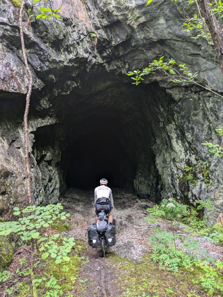 We follow an old rail line along a fjord that takes us down a very sporty single track trail to the entry to a dark abandoned train tunnel. There seems to be no other route. We go for it, walking through the cold dark with just our bike lights to illuminate the chiseled rock walls. After ten minutes we get nervous but keep going (what’s the alternative?) and eventually see the exit.