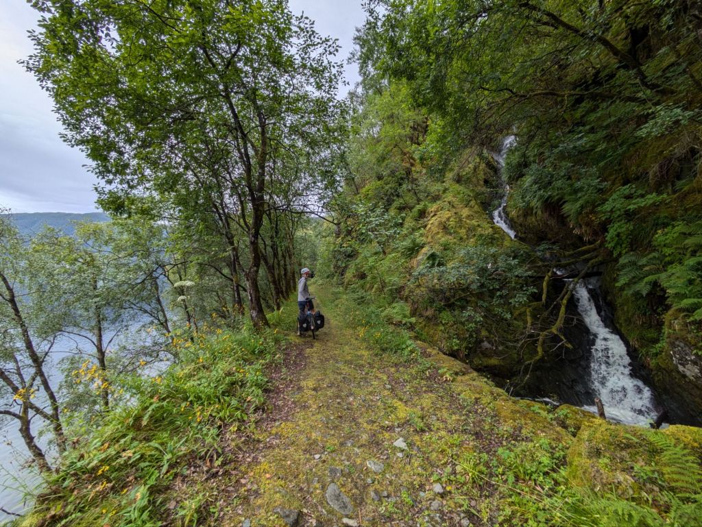 In truth, many things are once in a lifetime experiences. But it often takes something dramatic, something truly special, to really get our attention and make us realize that this moment, this exact experience, will never happen again. Bike touring has a way of eliciting that wonder and gratitude, as it has the past couple of days. After all, how often do you get to ride on forested gravel roads along a deep fjord, through abandoned rail tunnels and up a steep one lane road to a magical mountain plateau with a string of pristine alpine lakes, waterfalls, lush forests and along the way eat wild raspberries and then stumble upon a farm stand with three generations of women selling the sweetest strawberries imaginable from their garden?