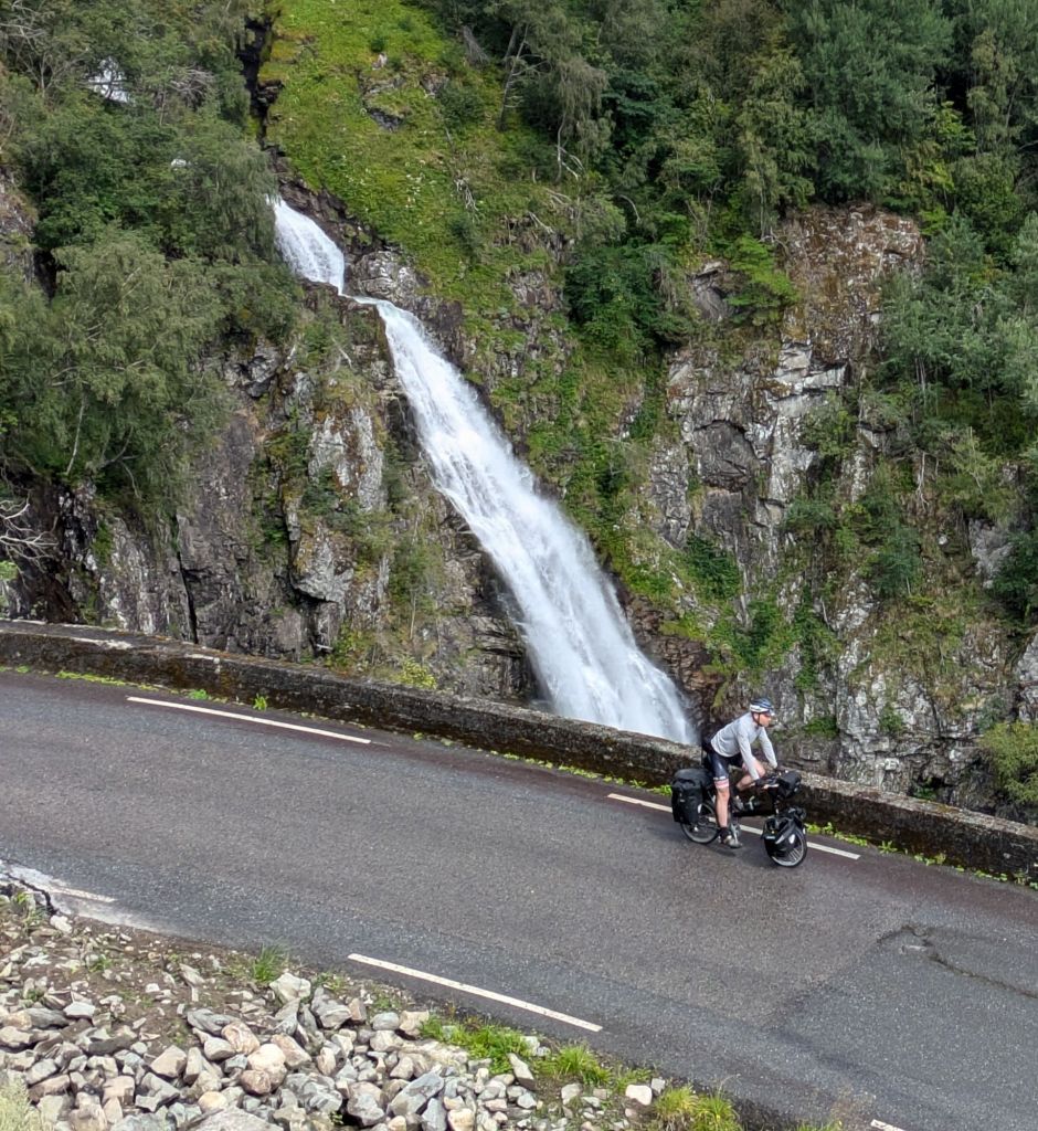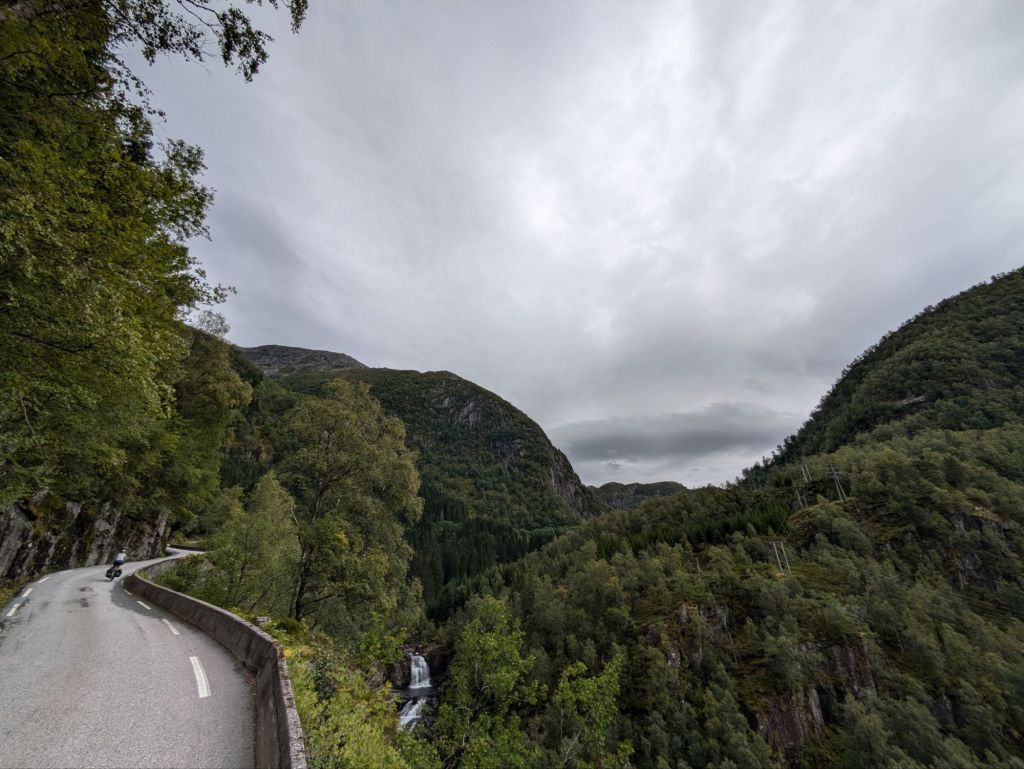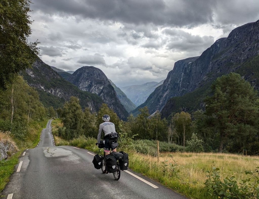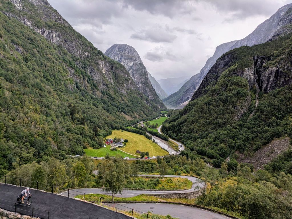 We begin to climb again towards Gudvangen, and spend a few hours on a busy two lane highway in heavy rain. The drivers are respectful but it’s physically and mentally taxing. On bike tours you get the highs and lows. We eventually get back onto a quiet and beautiful road that we take up a smaller mountain pass, stopping to eat delicious wild raspberries on the side of the road, and down a ridiculous series of hairpin turns that descend 1,000 feet in less than a mile into the river valley below. We ride into Gudvangen Camping, where a rustic cabin is waiting for us. A hot shower in the bath house and we are revived.