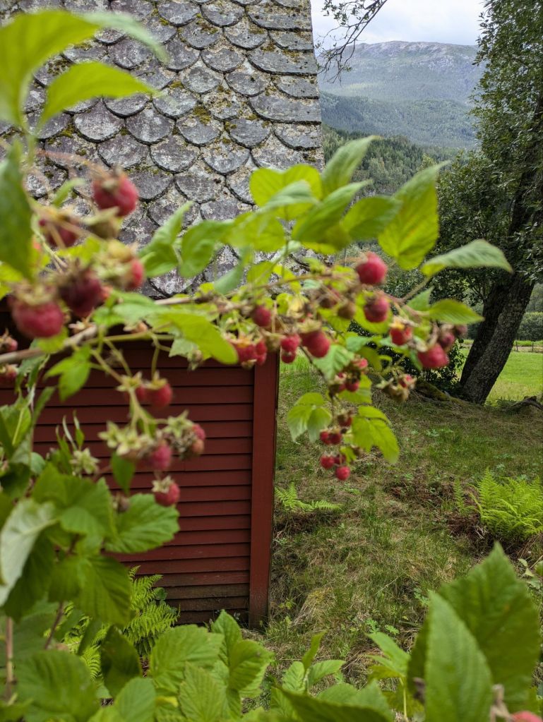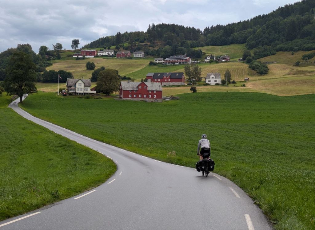 We leave Bergen in light rain, following bike paths and small country roads into the mountains. The weather here is constantly changing and we quickly get used to putting on and taking off our rain coats. By the end of the day, we will have been soaked many times. But it’s summer and the sun breaks through the clouds periodically to dry us out and keep us warm. We follow small country roads through quaint villages with well maintained homes painted in dark reds and ochres, often with cheerful planters of flowers to celebrate summer and stores of carefully stacked firewood waiting for winter.